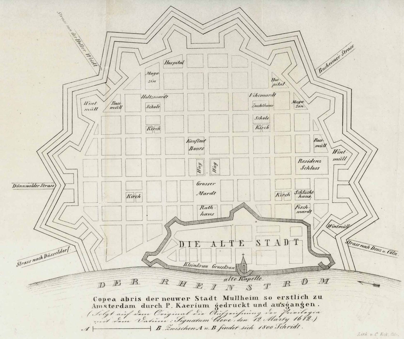 Stadtplan (‘Copea abris der neuwer Stadt Mullheim so erstlich zu Amsterdam durch P. Kaerium gedruckt und ausgangen.’), Lithographie v. C. Eck in Köln, 1846, 20 x 23 cm