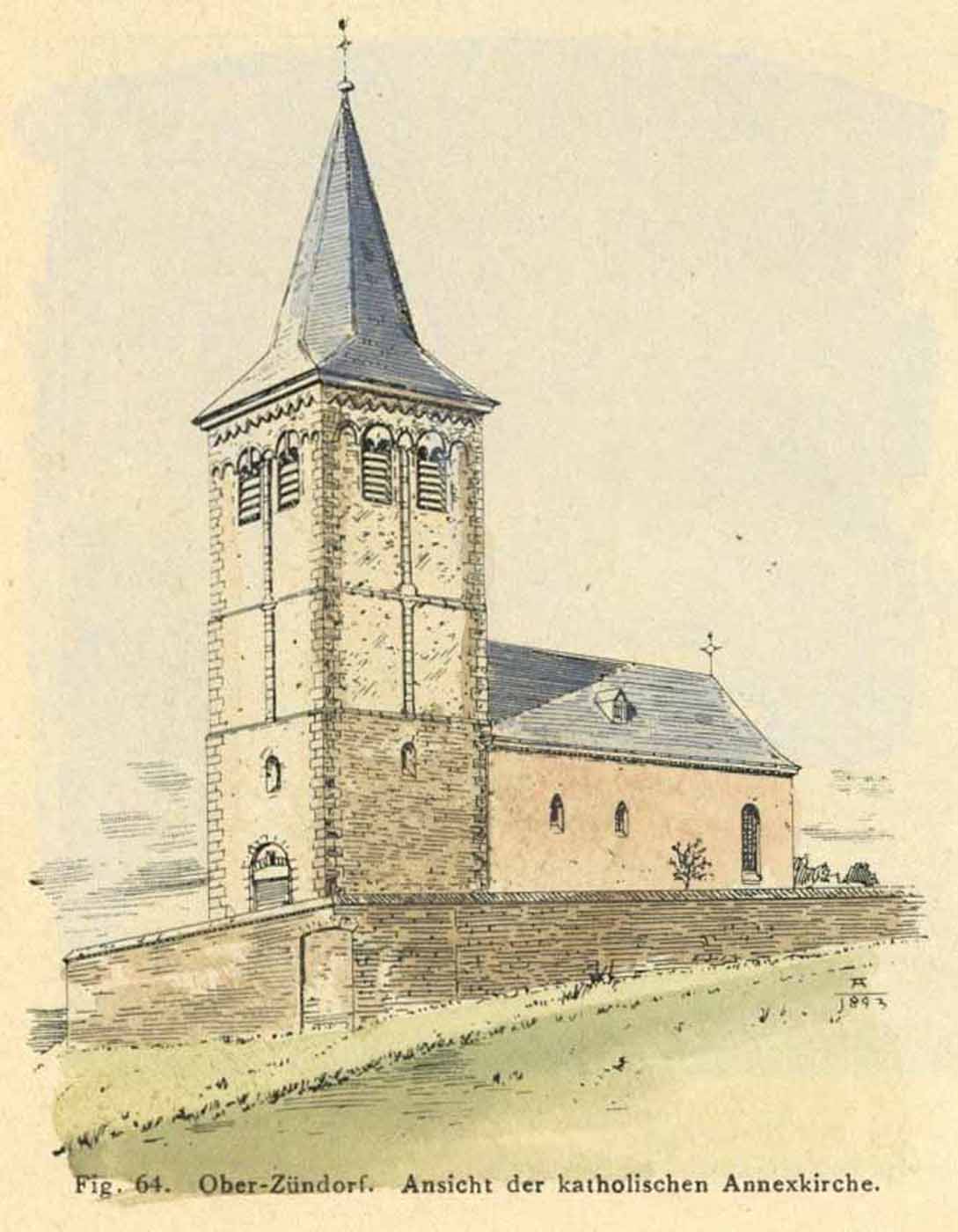 St. Martin (‘Ober-Zündorf. Ansicht der katholischen Annexkirche’), kolorierter Holzstich, dat. 1883, 10,5 x 8 cm