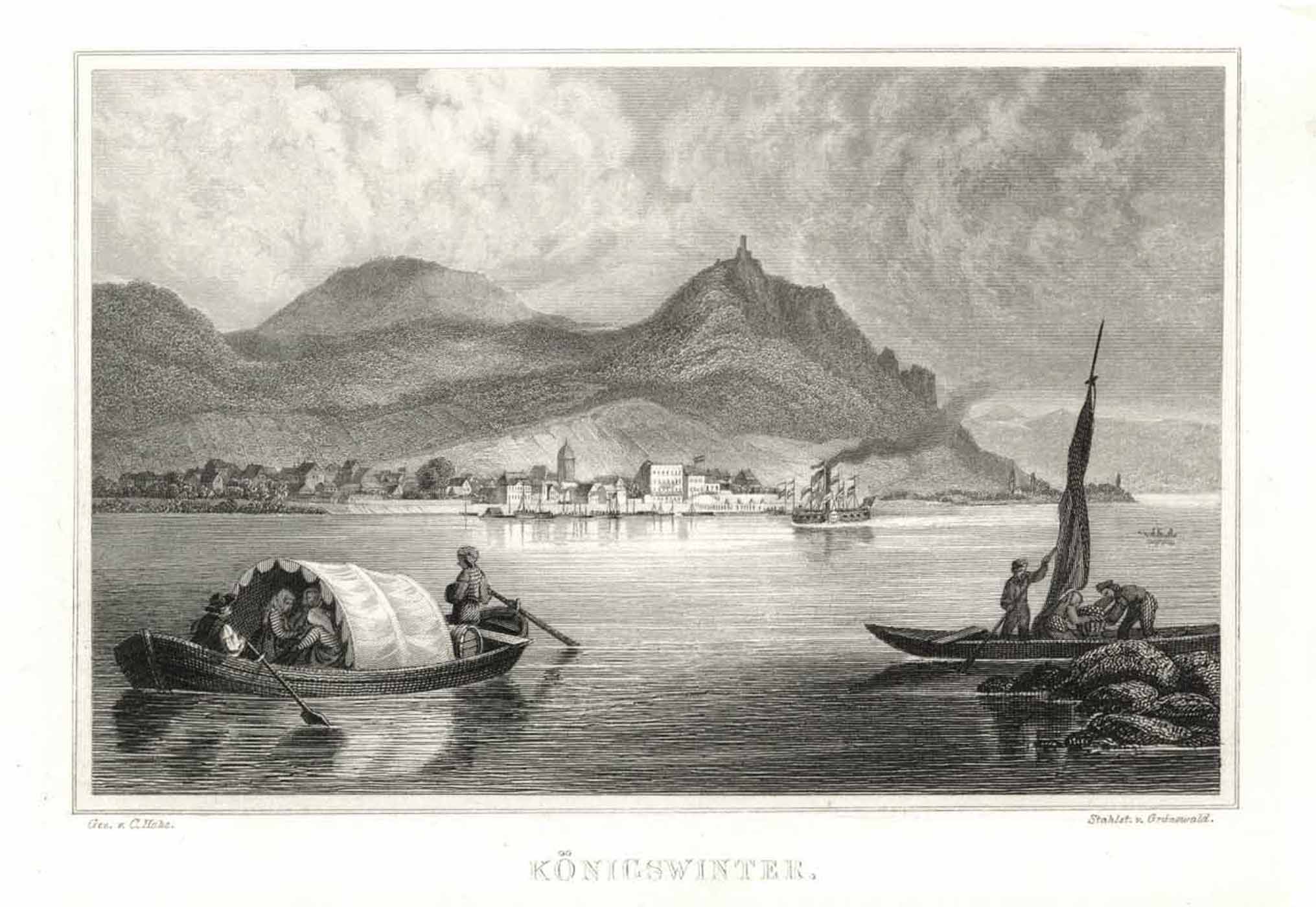 Gesamtansicht über den Rhein (‘Königswinter.’), Stahlstich v. Grünewald n. Hohe, 1865, 11 x 15,5 cm