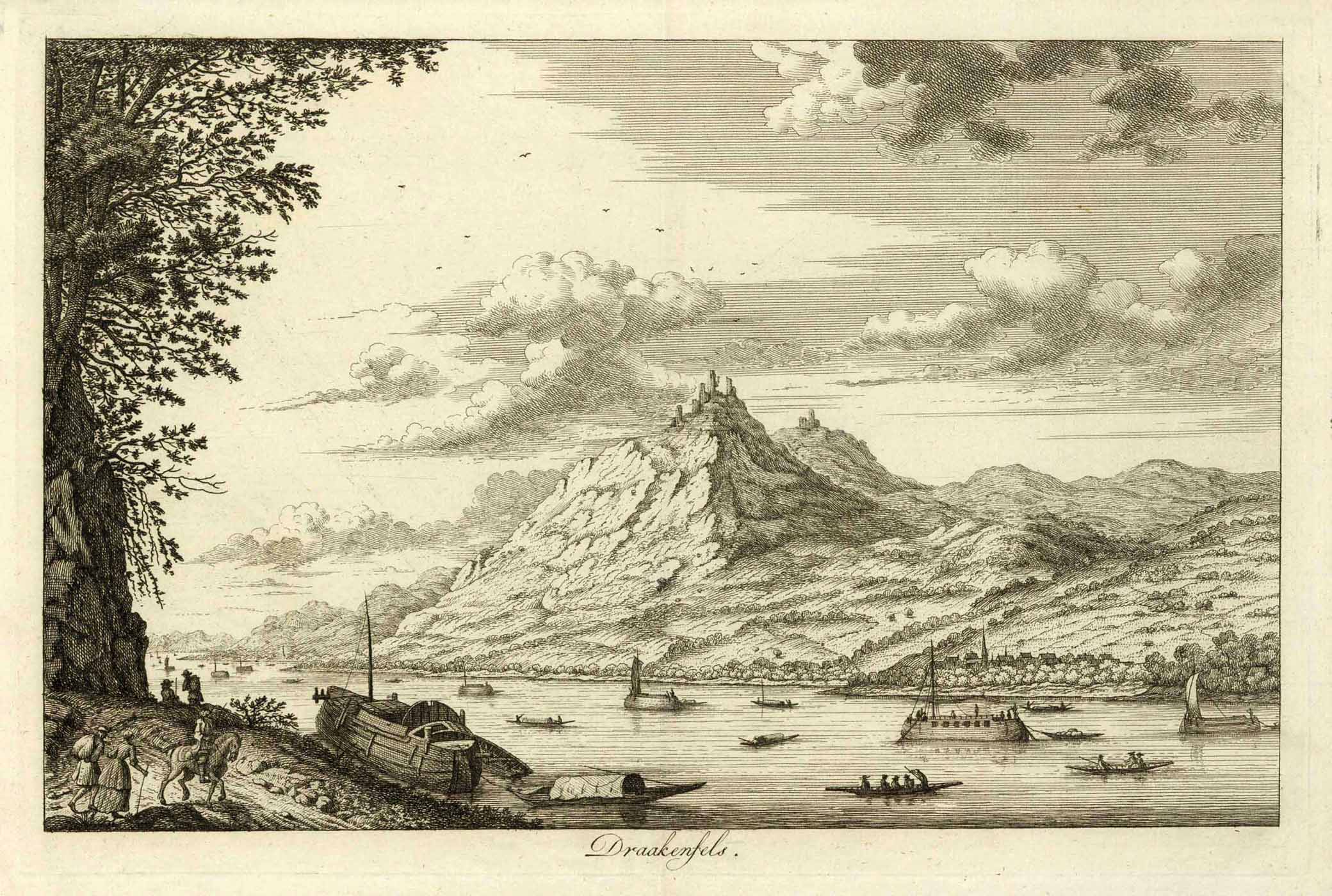 Drachenfels mit Blick auf das Siebengebirge; rechts Rhöndorf (‘Draakenfels’), Kupferstich b. Saakes, 1774, 22 x 32,5 cm