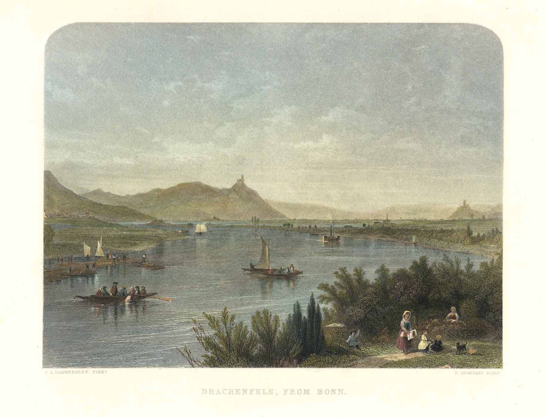 Drachenfels mit der Rheinebene (‘Drachenfels, from Bonn’), kolorierter Stahlstich v. Robert Brandard n. James Astbury Hammersley b. Virtue & Co, 1872, 19,5 x 24,5 cm