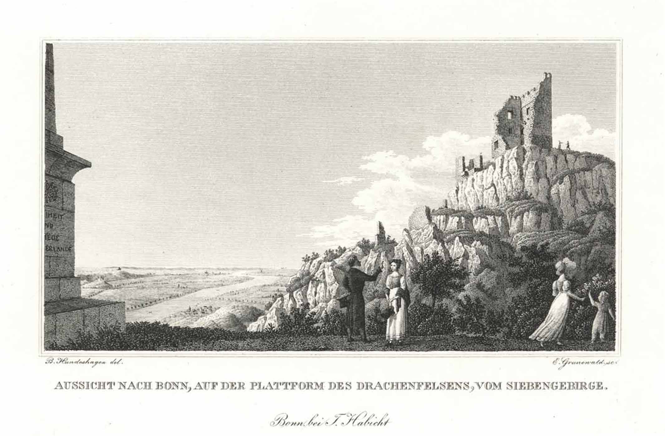 Blick vom Drachenfels in die Rheinebene nach Bonn (‘Aussicht nach Bonn, auf der Plattform des Drachenfelsens, vom Siebengebirge’), Stahlstich v. Grunewald n. Hundeshagen b. Tobias Habicht in Bonn, 1851, 10 x 16 cm