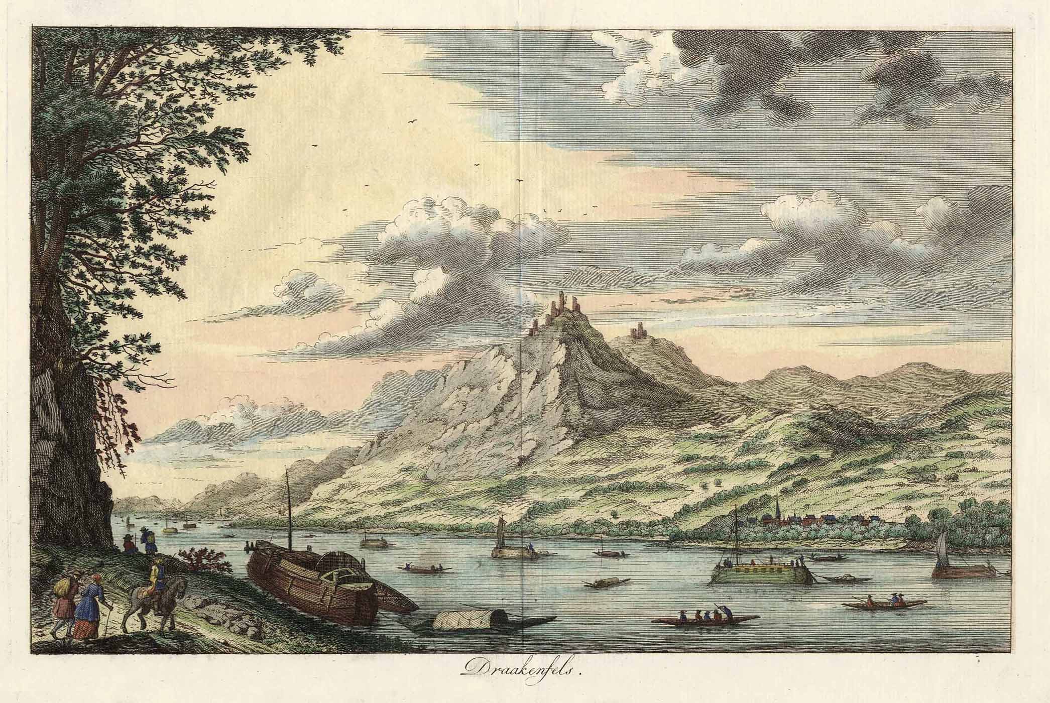 Drachenfels mit Blick auf das Siebengebirge; rechts Rhöndorf (‘De Berg Draakenfels, en’t Steedjen Bundorf’), kolorierter Kupferstich b. Saakes, 1774, 22 x 32,5 cm