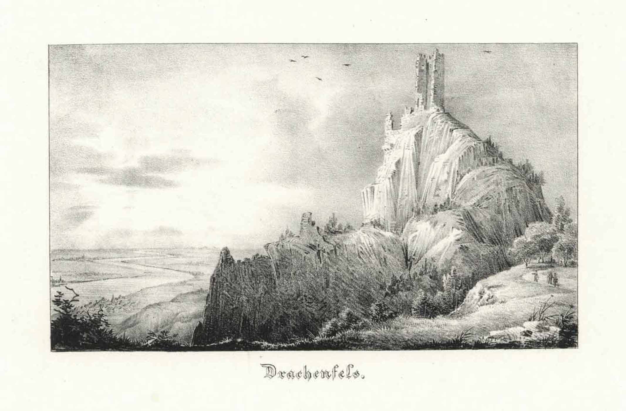 Drachenfels mit Blick ins Rheintal (‘Drachenfels.’), Lithographie b. Henry & Cohen in Bonn, 1837, 9 x 14 cm