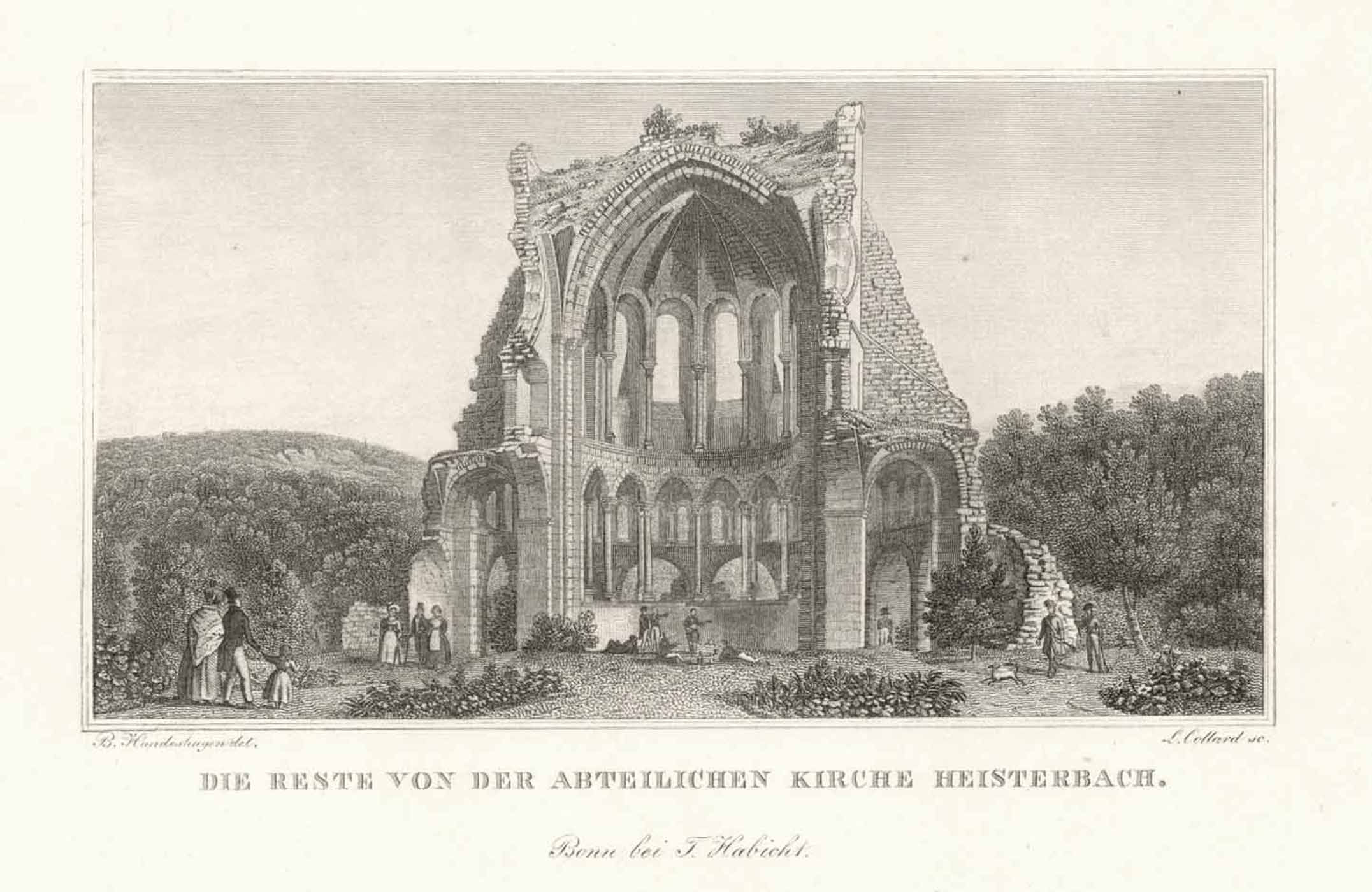 Zisterzienserklosterruine (‘Die Reste von der Abteilichen Kirche Heisterbach.’), Stahlstich v. L. Collard n. B. Hundeshagen b. Tobias Habicht in Bonn, 1851, 9,5 x 16 cm