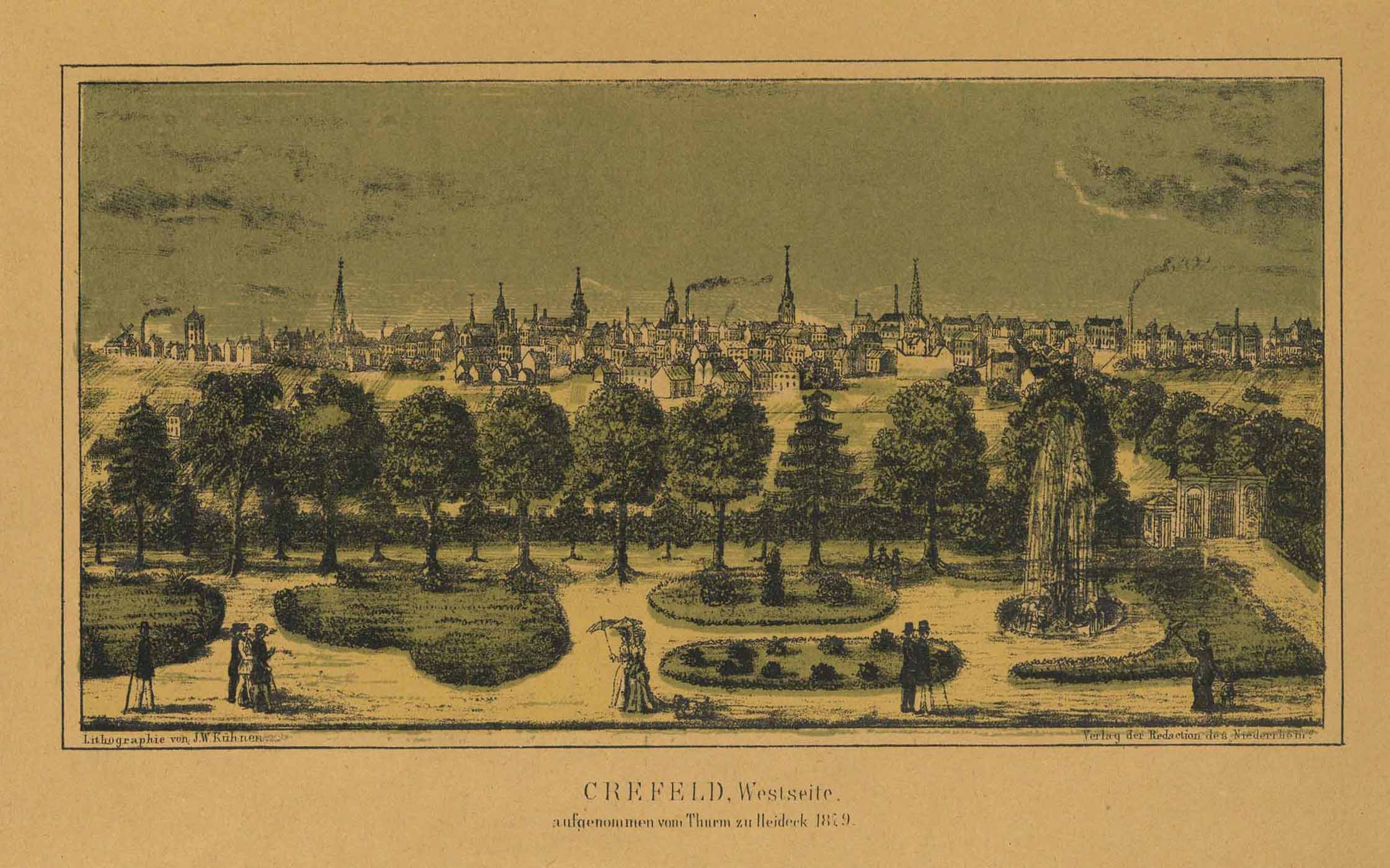 Gesamtansicht im Jahre 1850 von der Westseite, aufgenommen vom Turm zu Heideck 1879, Lithographie in Farben gedruckt v. J.W. Kühnen aus Redaction des “Niederrhein”, um 1879, 16 x 27 cm