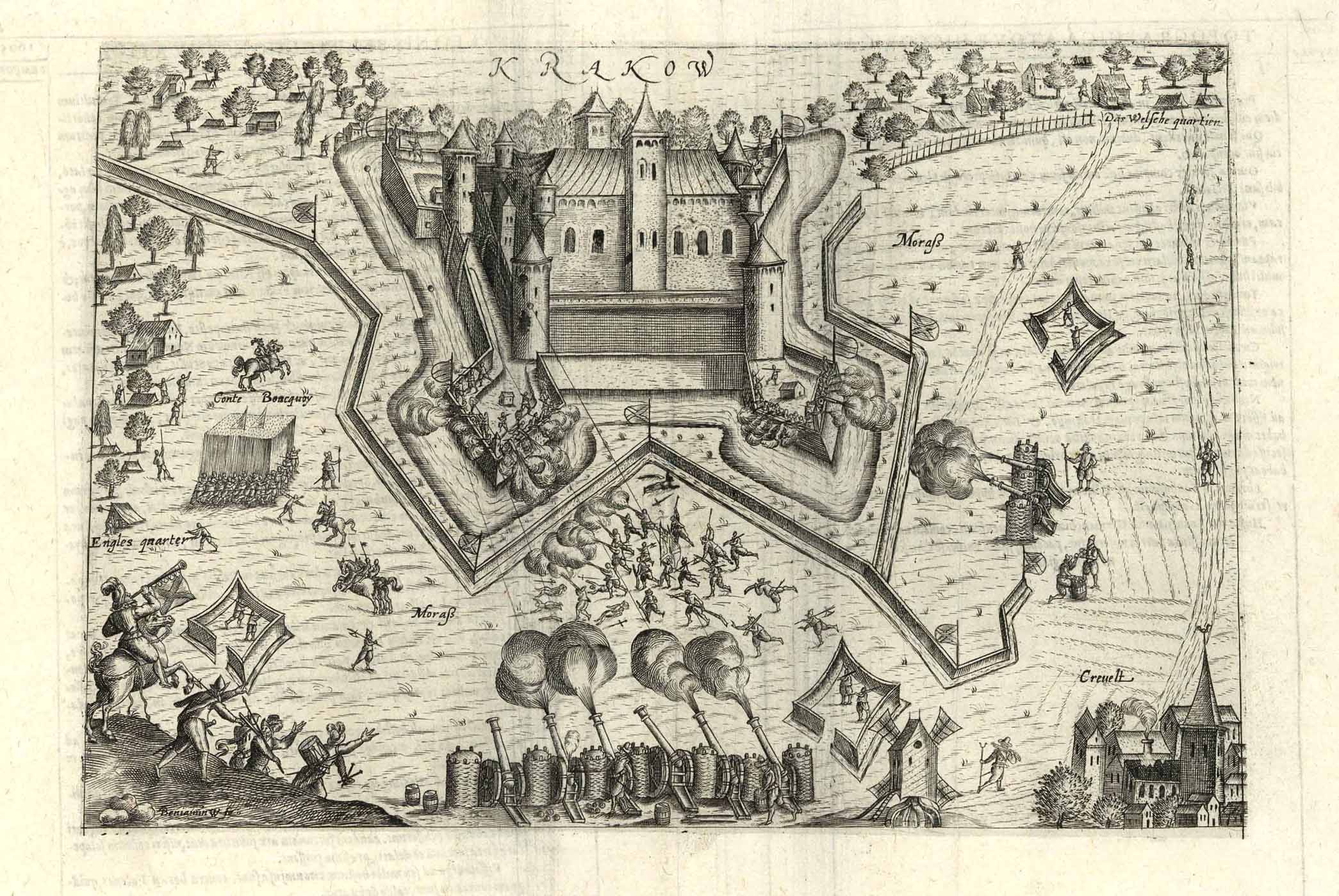 Schloß Crakau mit der Einnahme durch Spinola am 4.-7. November 1605, Kupferstich v. Franz & Abraham Hogenberg b. Michael Frhr. von Aitzing, 1606, 18,5 x 27 cm