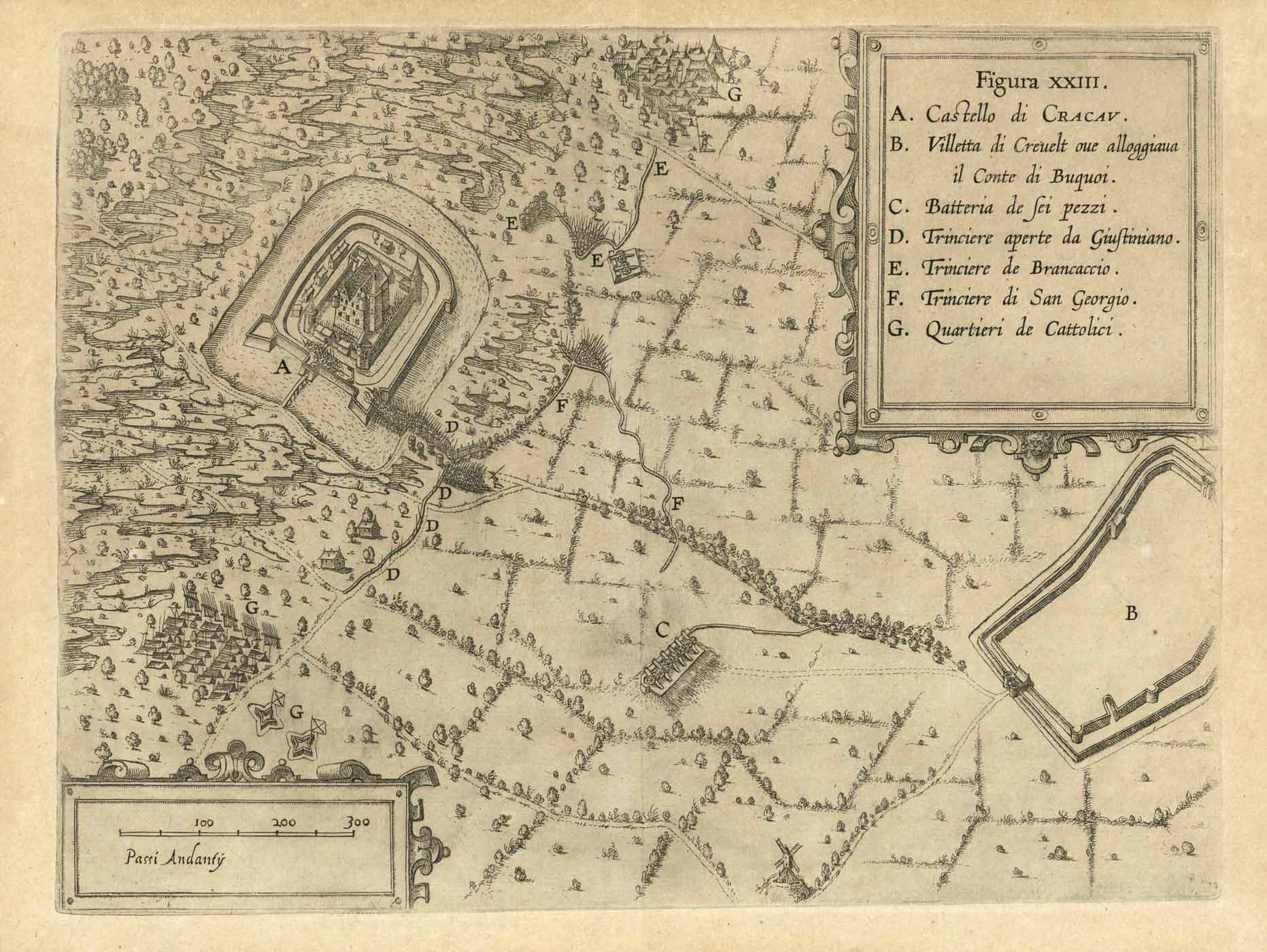 Schloß Crakau aus der Vogelschau mit der Einnahme durch Spinola am 4.-7. November 1605, Kupferstich b. Giustiniano, 1609, 22 x 29 cm (jetzt mit ausgefüllter Maßstabkartusche unten links)