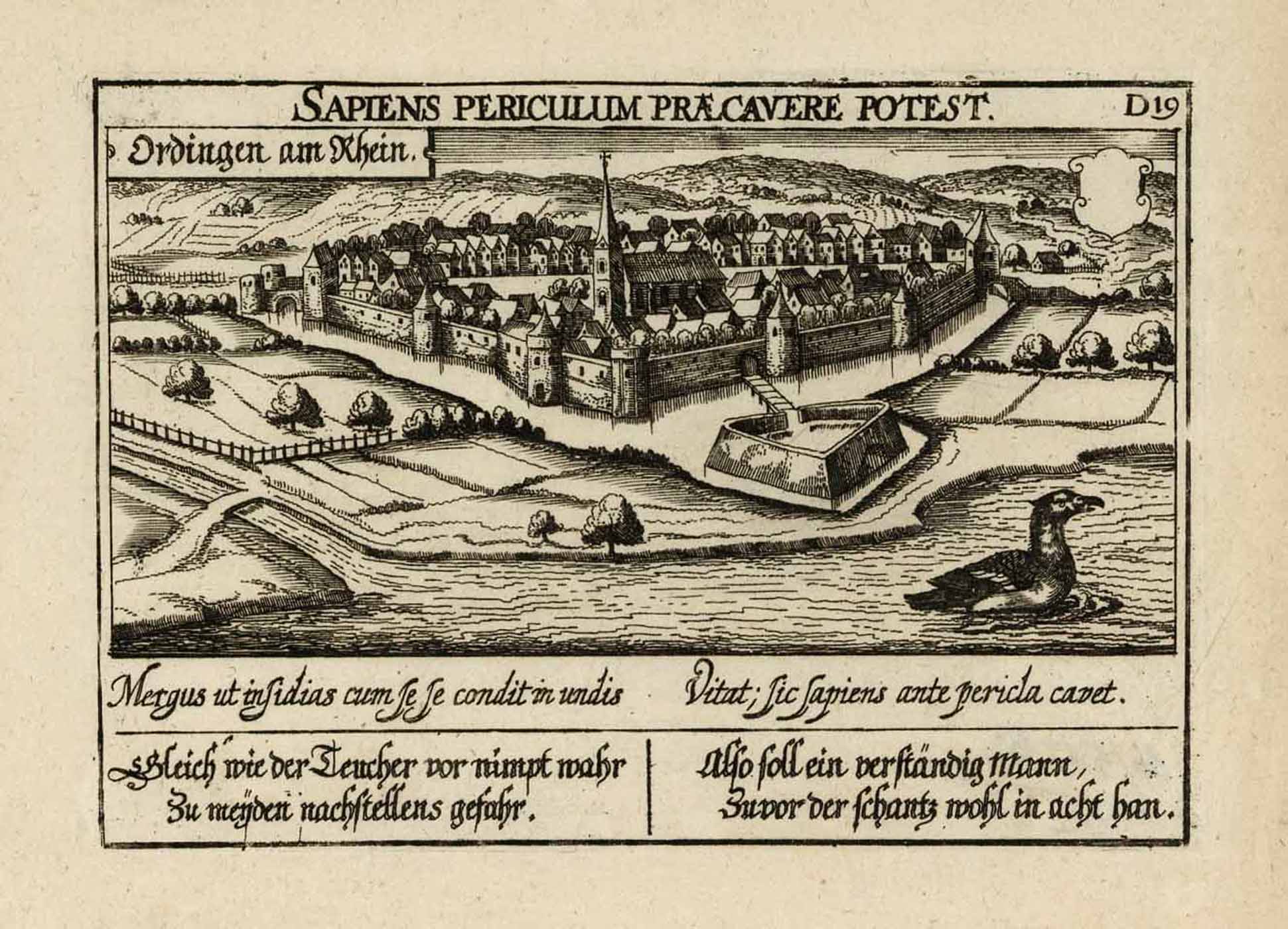 Gesamtansicht (‘Ordingen am Rhein. – D19’), Kupferstich aus Thesaurus Philo-Politicus … (Meisner Schatzkästlein), 1638, 10,5 x 14,5 cm