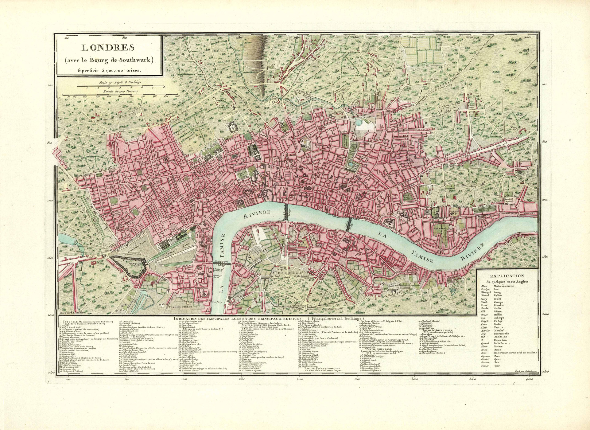 Stadtplan (‘Londres – avec le Bourg de Southwark’), altkolorierter Kupferstich v. Pierre Francois Tardieu & Dubuisson, um 1782, 32 x 46 cm