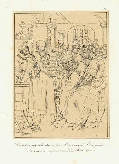 ‘Gutenberg zeigt den staunenden Mainzern die Erzeugnisse der von ihm erfundenen Buchdruckerkunst’, getönte Umrisslithographie v. Geiyer, 1861, 20,5 x 14 cm