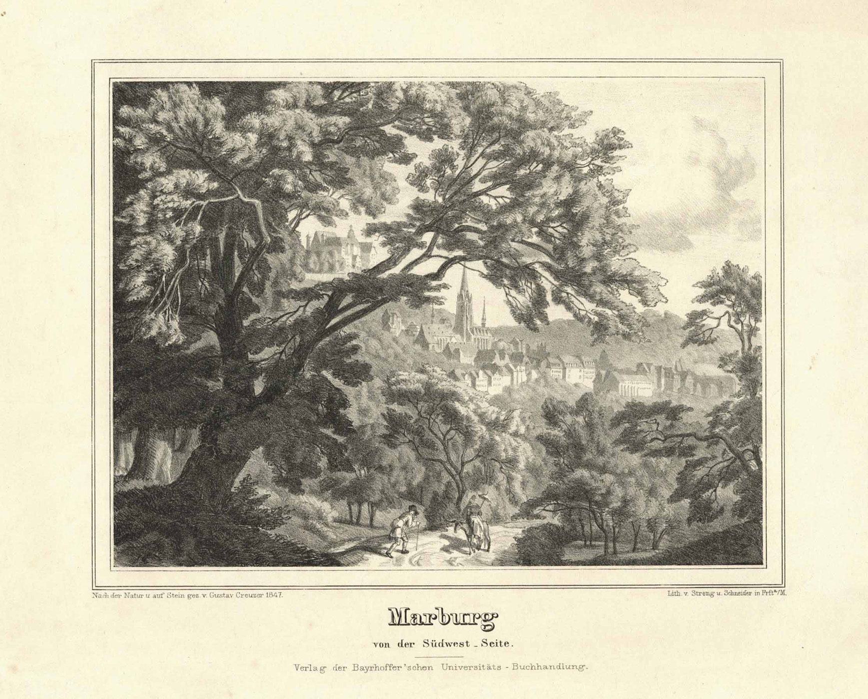 Gesamtansicht (‘Marburg von der Südwest-Seite’), Lithographie v. Streng u. Schneider in Frankfurt n. Gustav Creuzer b. Bayrhoffer Universiäts-Buchhandlung, dat. 1847, 20 x 22,5 cm