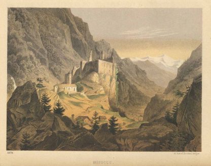 Castello di Mesocco und die Kirche Santa Maria del Castello; im Hintergrund Blick auf Mesocco (‘Misocco.’), Farblithographie b. E. Hochdanz in Stuttgart, dat. 1870, 17 x 21,5 cm