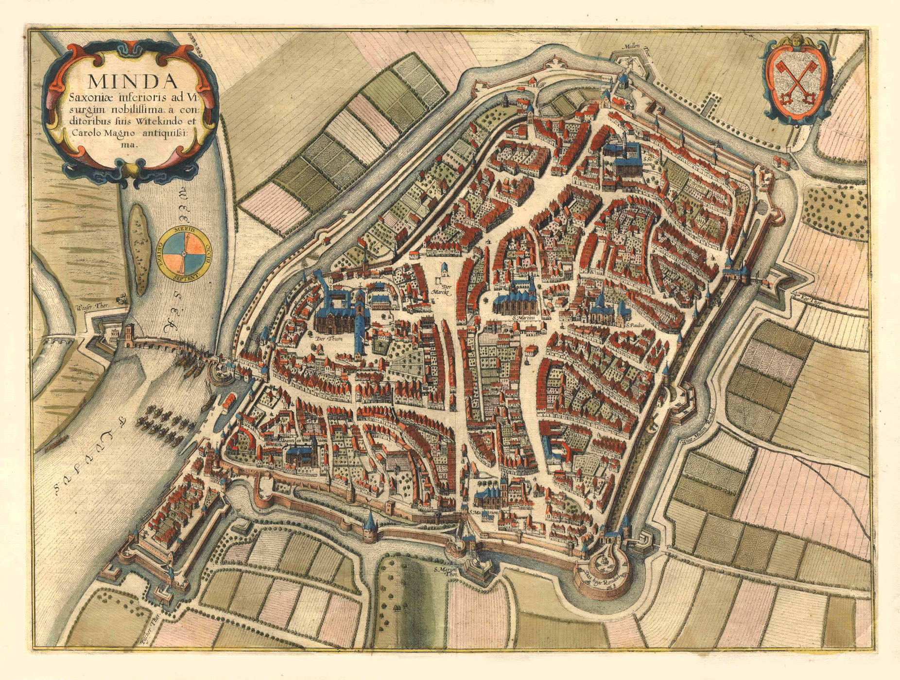 Gesamtansicht aus der Vogelschau (‘Minda Saxoniae inferioris ad Visurgim nobilissima, à conditoribus suis Witekind et Carlo Magno antiquissima’), altkolorierter Kupferstich v. Wenzel Hollar aus Germaniae Superioris b. Johannes Janssonius (Jansson) in Amsterdam, 1657, 37 x 50 cm