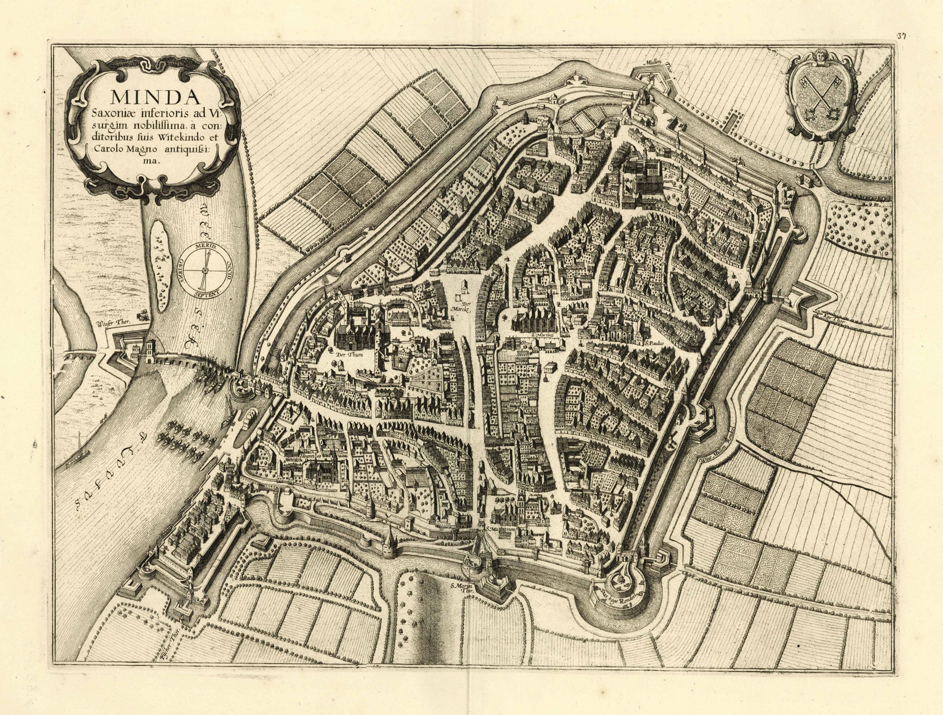 van der Krogt, Koeman’s Atlantes Neerlandici, Vol. IV-2, 2777 Minden:42; Parthey, Wenzel Hollar, Nr. 869. – Die Ansicht ohne Rückentext und die Nummer “37” oben rechts außerhalb in Manuskript. – Perfekter kräftiger Abzug der Platte und tadelloses Exemplar. – Selten in diesem Zustand!