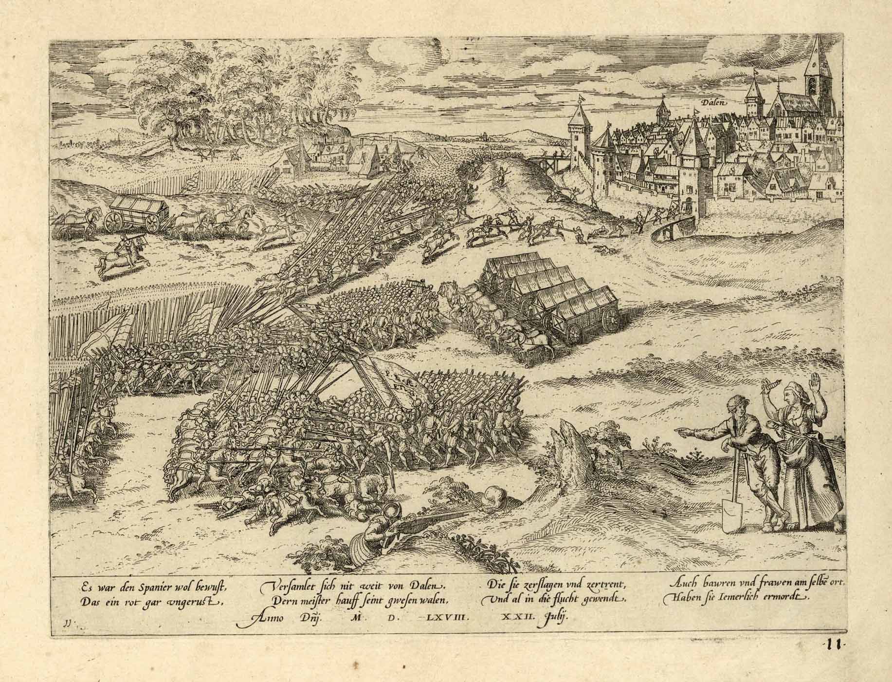 Gesamtansicht mit Belagerung am 22.07.1568, Kupferstich aus Hogenbergs Geschichtsblättern, 1568, 20,5 x 27,5 cm