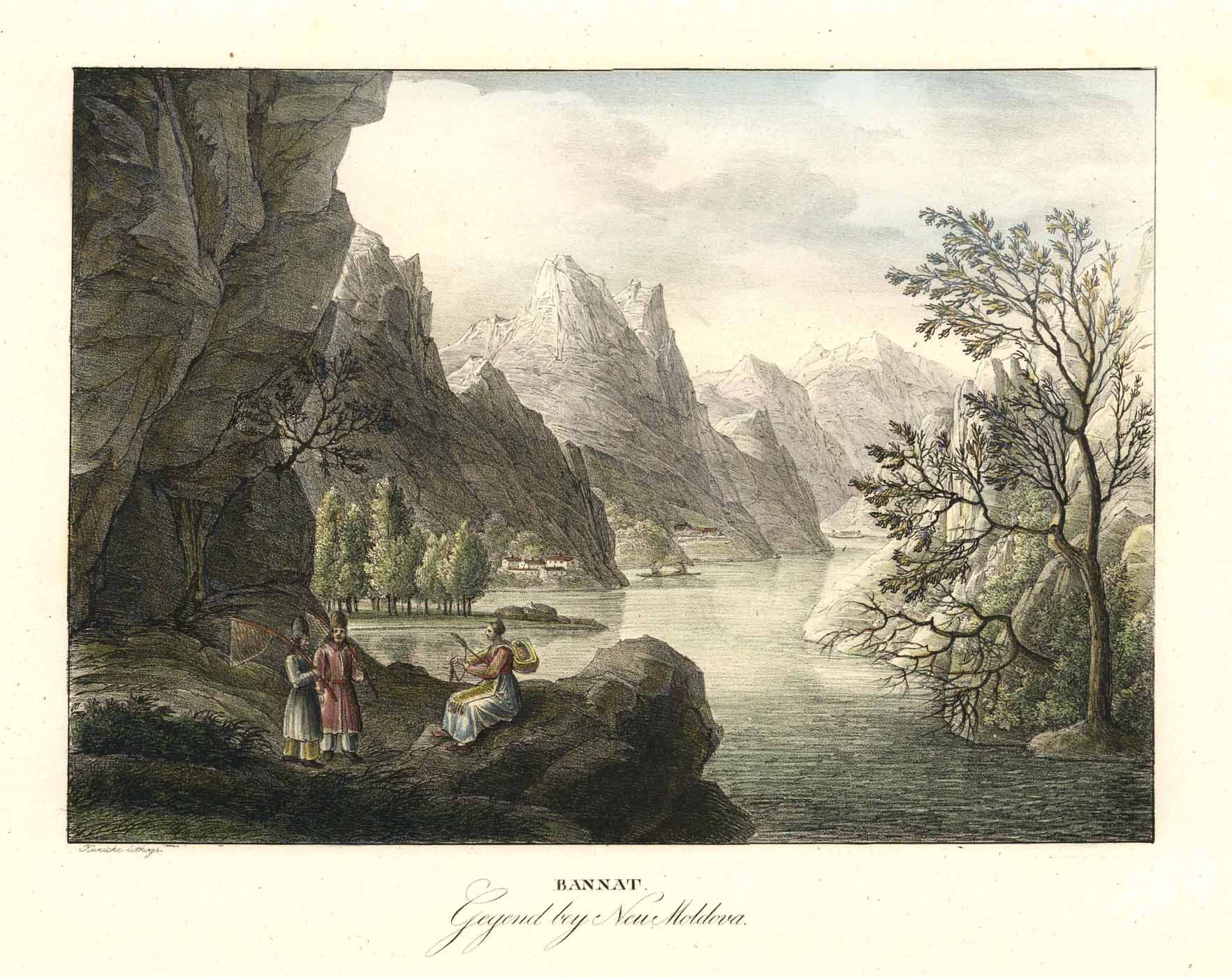Ansicht bei Moldova-Nova (‘Bannat. – Gegend bey Neu Moldova.’), kolorierte Lithographie v. Adolph Kunike, 1826, 29 x 35,5 cm