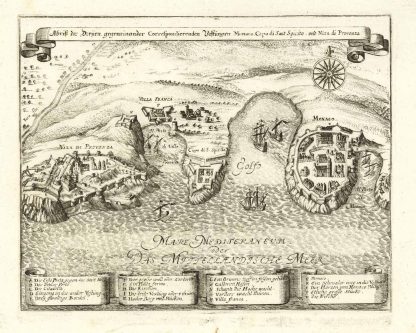 Vgl. Fauser, Repertorium älterer Topographie. Druckgraphik von 1486 bis 1750, Bd. II, S. 502, Nr. 9016. – Zeigt die Küste der Côte d’Azur (Provence) aus der halben Vogelschau mit den Städten Nizza (Nice), Villefranche-sur-Mer, Cap-Ferrat u. Monaco. – Oben Girlande mit Vedutentitel; darunter rechts große Kompaßrose; unten Girlande in 4 Abteilungen mit Erklärungen von A – V. – 1. Zustand dieser Ansicht, die später noch bei Bodenehr u. Kilian erschien.