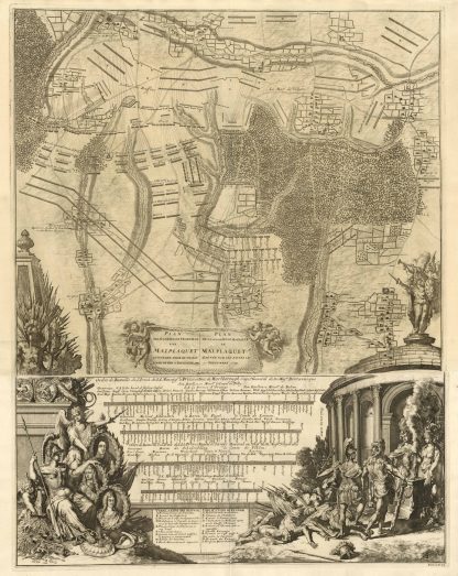 Zeigt die Schlacht bei Malplaquet im Jahre 1709 mit dem Gebiet zwischen Mons und Taisnières-sur-Hon und Einzeichnungen der Dörfer Wasmes, Warquignies, Goegnies-Chaussée, Blaregnies, Malplaque u.a. mit den Truppenstellungen. – Prächtiger Kupferstich von 2 Platten gedruckt. – Unter der Karte Truppenstellungen und Auflistungen der Armeen. – Links und rechts Porträts der Heerführer (John Churchill, dem Duke of Marlborough und Prinz Eugen, Claude-Louis-Hector de Villars) und Allegorien zur blutigen Schlacht.
