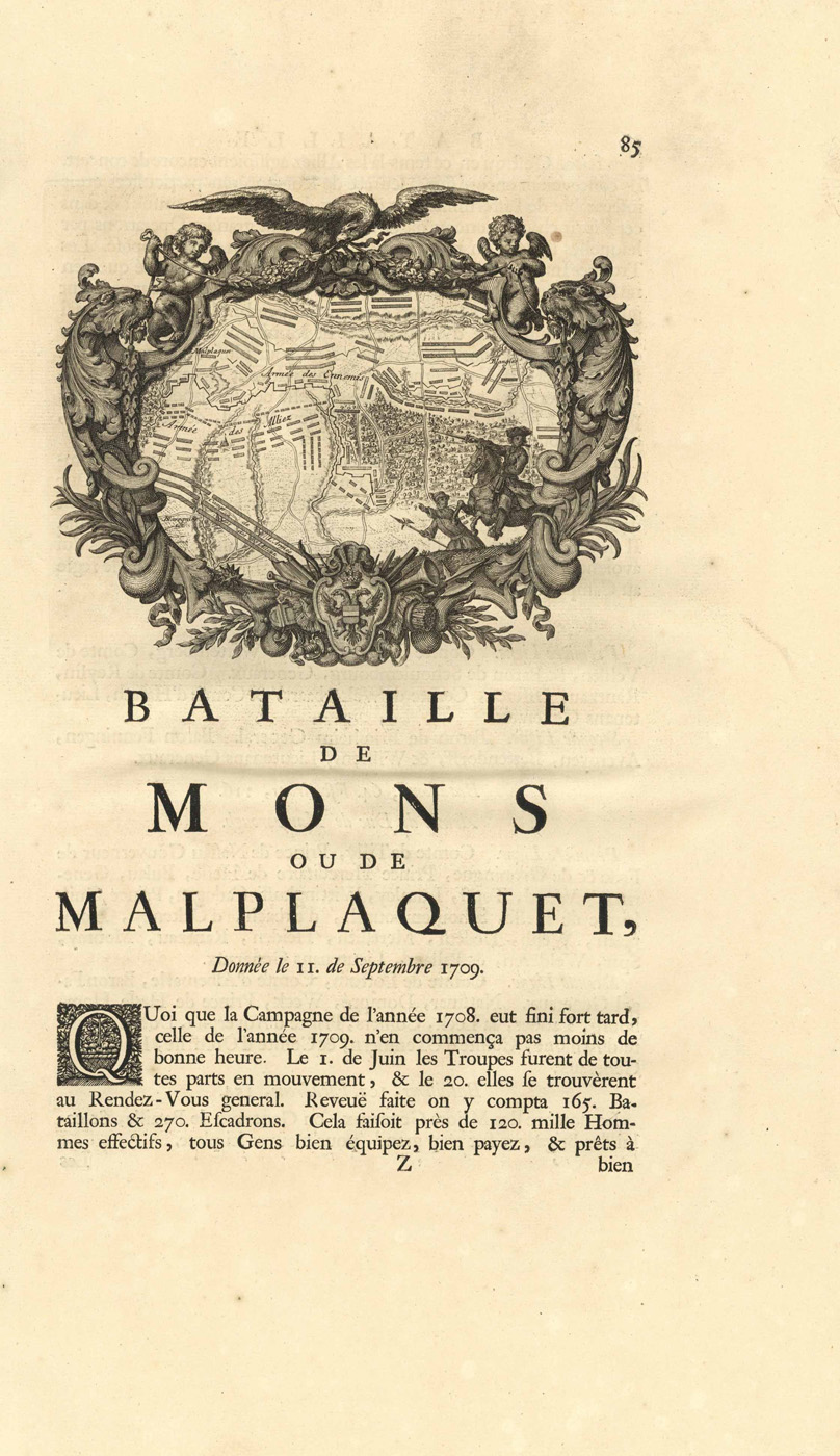Schlacht im Jahre 1709 (‘Bataille De Mons Ou De Malplaquet; Donnée le 11. de Septembre 1709.’), Kupferstich aus Histoire militaire du Prince Eugene de Savoye, du Prince et Duc de Marlborough b. Isaac van der Kloot in Den Haag, 1729, 33 x 21 cm