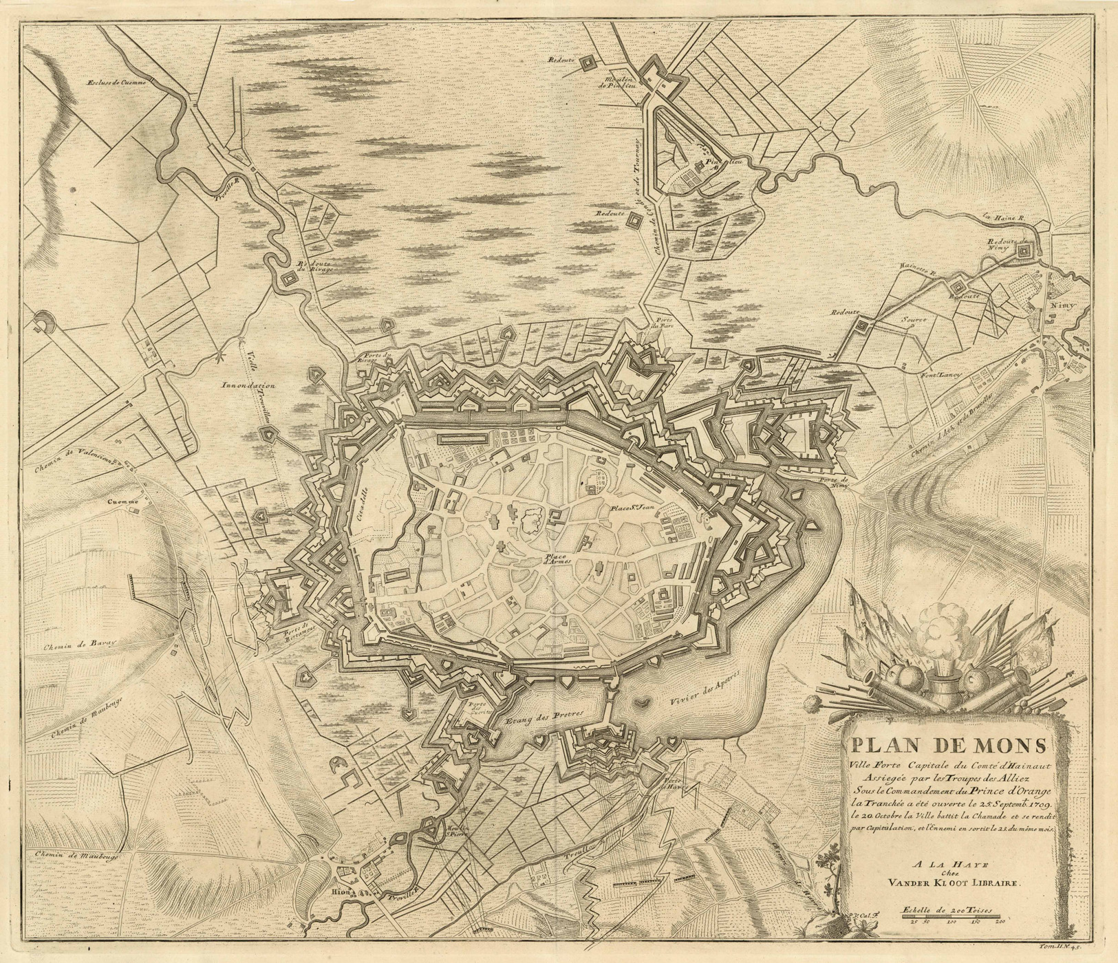 Befestigungsplan im Jahre 1709 (‘Plan De Mons Ville Forte du Comté d’Hainaut … 25. Septemb. 1709 … A La Haye Chez Vander Kloot Libraire.’), Kupferstich v. Jan van Cal aus Histoire militaire du Prince Eugene de Savoye, du Prince et Duc de Marlborough b. Isaac van der Kloot in Den Haag, 1729, 50,5 x 59 cm