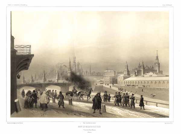 Gesamtansicht (‘Pont De Moskva Retzkoi 15 Janvier 1840, à Moscou Russie’), getönte Lithographie v. Sabatier n. Lauvergne gedr. b. Lemercier in Paris aus Voyages en Scandinavie, en Laponie, etc. … dat. 1840, 33 x 43,5 cm