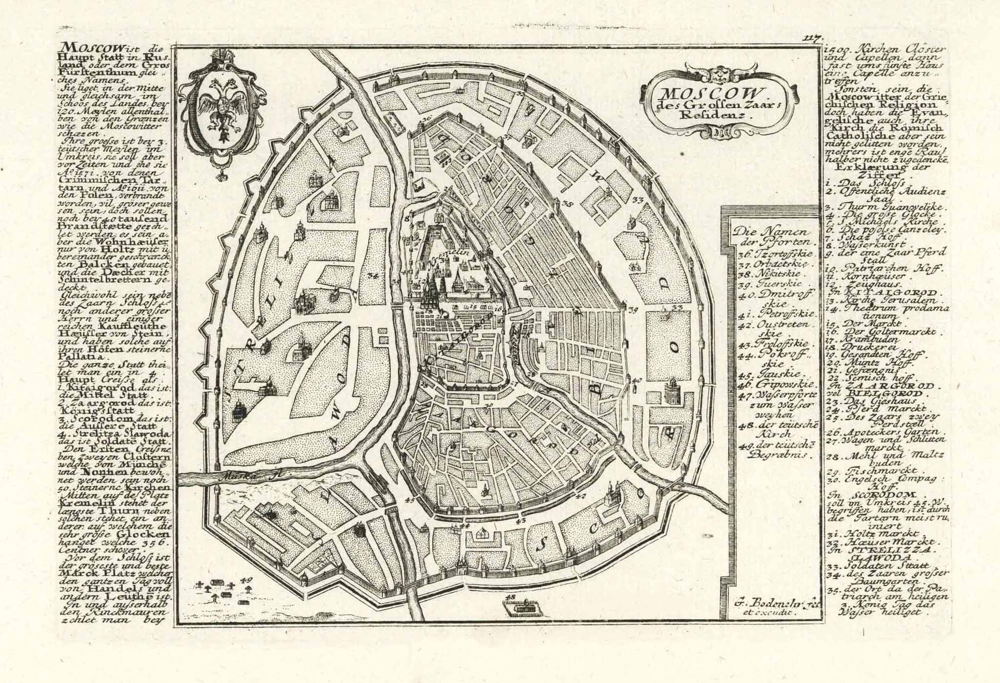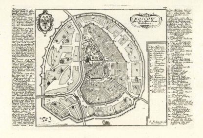 Fauser, Repertorium älterer Topographie. Druckgraphik von 1486 bis 1750, Bd. II, S. 511 f., Nr. 9207. – Zeigt einen Stadtplan von Moskau. – Oben links Doppeladler; oben rechts Kartusche mit Vedutentitel in 3 Zeilen; links u. rechts neben dem Plan Legende.