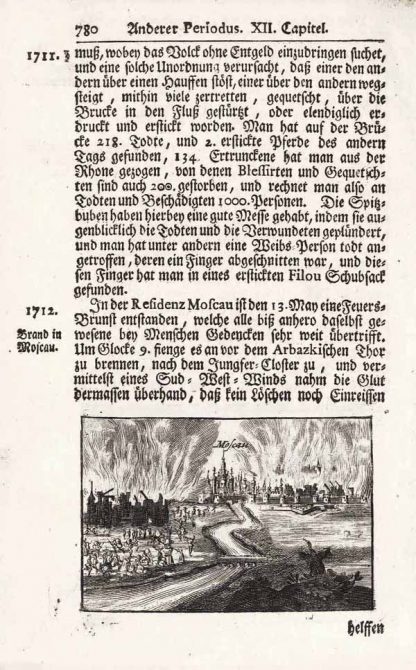 Gesamtansicht mit Belagerung und der brennenden Stadt (‘Moscau’), Kupferstich b. Johann Leonhard Buggel u. Johann Andreas Seitz, 1718, 5,5 x 8,5 (ganze Buchseite 19 x 12) cm