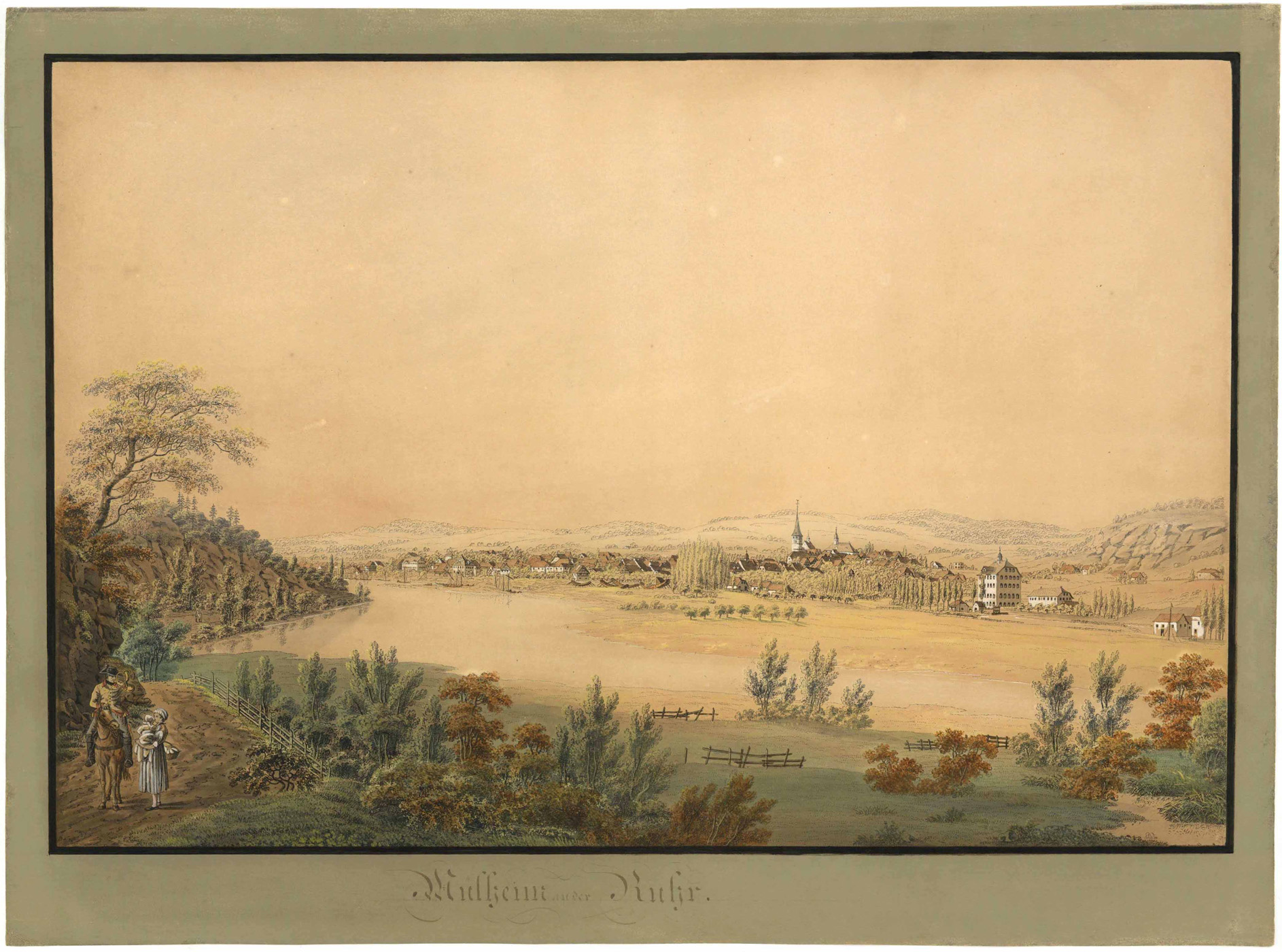 Denecke, Mülheim an der Ruhr in Stadtansichten aus vier Jahrhunderten, S. 22-23. Thieme-Becker, Bd. IV. S. 115. – J.H. Bleuler (Zollikon bei Zürich 1758 – Feuerthalen 1823) war Landschaftsmaler und Kupferstecher und berühmt für seine Landschaftsgouachen. – Mit schwarzer Einfassunglinie und mit grün gouachierter Umrandung. – Sehr gut erhaltenes Exemplar in wunderschönen Farben. – Erste Ansicht von Mülheim vom Broicher Ufer aus gesehen.