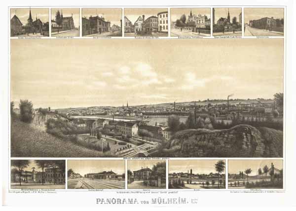 Nicht bei Denecke, Mülheim an der Ruhr in Stadtansichten aus vier Jahrhunderten. – Articus, Schles.-Holst. Ortsansichten von F.G. Müller. – Müller geb. 1816 in Roda (Stadtroda) gest. 1908 in Hannover lieferte über 130 Lithographien im wesentlichen aus Schleswig-Holstein, Niedersachsen u. Westfalen. – Müller arbeitete von 1844 bis 1884 in Verden. – Von 1884 an lebte er in Hannover. – Vorliegendes Souvenirblatt mit 13 Ansichten. – Mittig großes Panorama von Mülheim seitwärts vom lustigen Schneider gesehen; darüber große ev. Kirche, kath. Kirche, Bürgervereinshaus, Kriegerdenkmal für 1813, ev. Vereinshaus, kleine ev. luth. Kirche, Gymnasium; darunter Markt mit Rathaus u. Kriegerdenkmal, Central-Bahnhof, Casino, Broich u. Kettenbrücke. – Sehr selten!