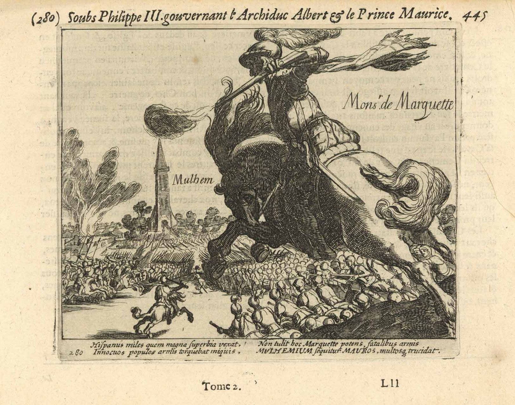 Ansicht von Mülheim mit der Kirche und Schlacht (‘Mulhem-Monsr. de Marquette’), Kupferstich b. Baudartius, 1616, 13 x 16 cm
