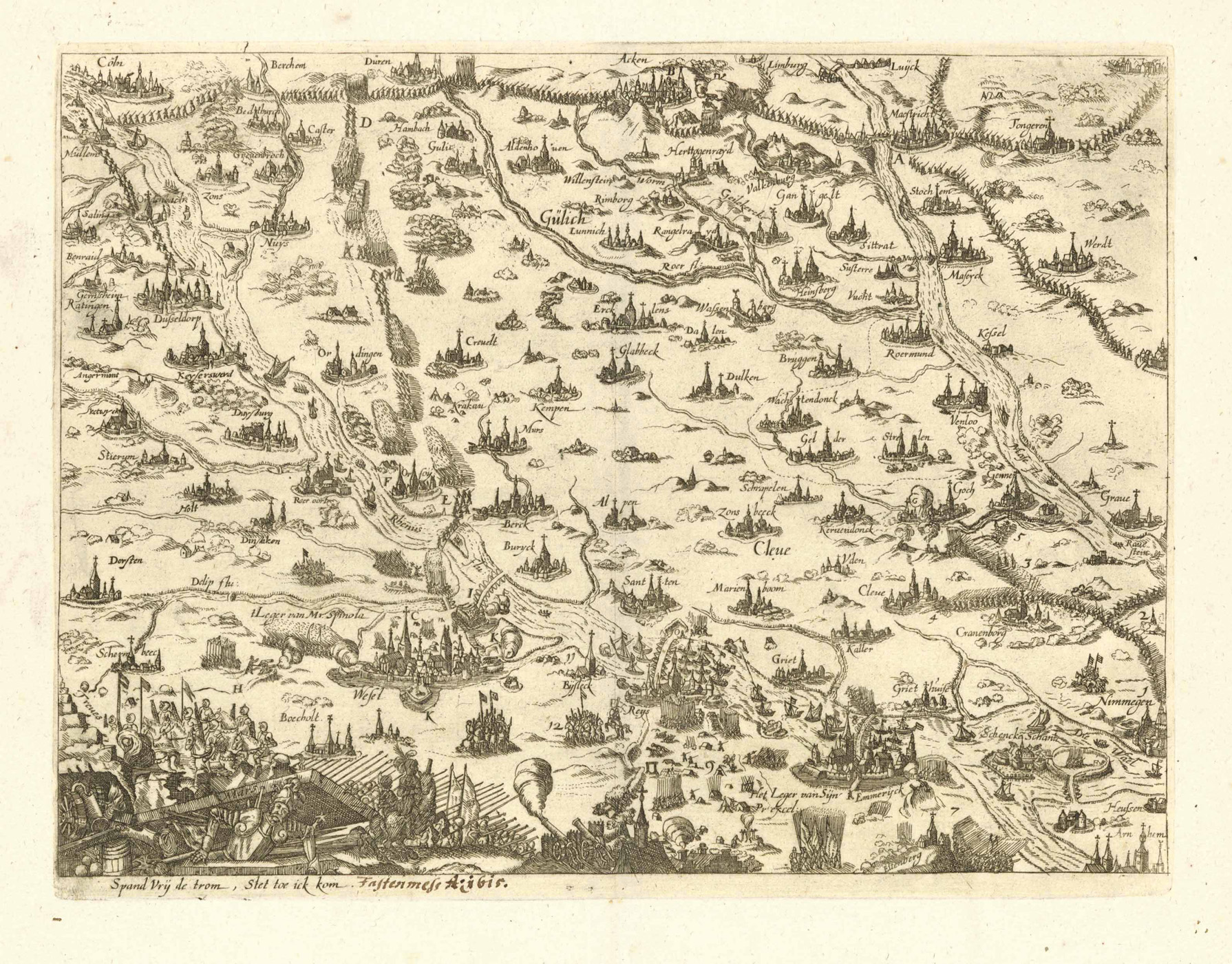 Vorliegendes Exemplar weder bei Braun, Angerhausen noch bei Neumann bekannt! (vgl. Braun, Geschichtliches Wesel; Bd.1, 14-15; vgl. Neumann; Stadt und Festung Jülich auf bildlichen Darstellungen, Nr. 89 – (zusätzliche Einzeichnung von Ortschaften, andere Typographie). – Niederrheinkarte in Vogelschauansicht mit dem Truppenaufmarsch der Heere von Spinola und Moritz von Oranien. – Zeigt das Gebiet zwischen Bocholt, Grave, Aachen und Ratingen mit den Städten Düsseldorf, Dorsten, Bocholt, Siegburg, Essen und Werden, Köln, Kaiserswerth, Krefeld, Neuss, Roermond, Venlo, Gennep, Tongern, Duisburg, Orsoy, Moers, Geldern, Wachtendonk, Dülken, Mönchengladbach, Maastricht, Aldenhoven, Düren, Jülich, Sonsbeck, Xanten, Emmerich, Grieth, Kalkar, Arnheim, Nijmegen (Nimwegen), Wesel, Kleve, Griethausen, Rees, Schermbeck etc.). – Am unteren Rand Kartusche mit dem Kriegsgott Mars, der mit seinen Waffen aus der Gruft steigt. – Sehr seltener Einblattdruck!