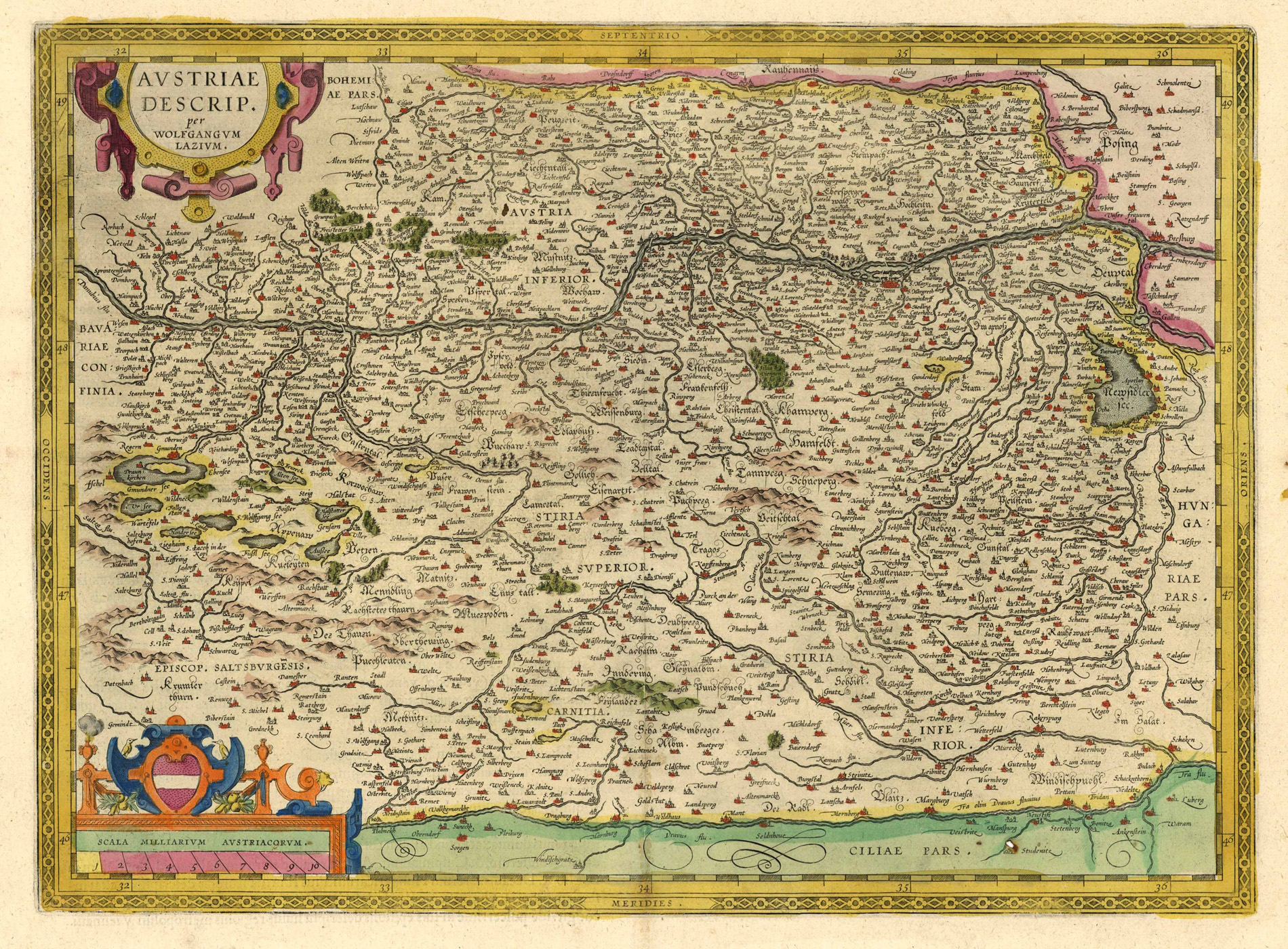 ‘Austriae Descrip. per Wolfgangum Lazium.’: Altkolorierter Kupferstich mit Bordüre v. Abraham Ortelius n. Wolfgang Lazius aus Theatrum Orbis Terrarum b. Jan Baptist Vrients in Antwerpen, 1609, 35 x 48 cm