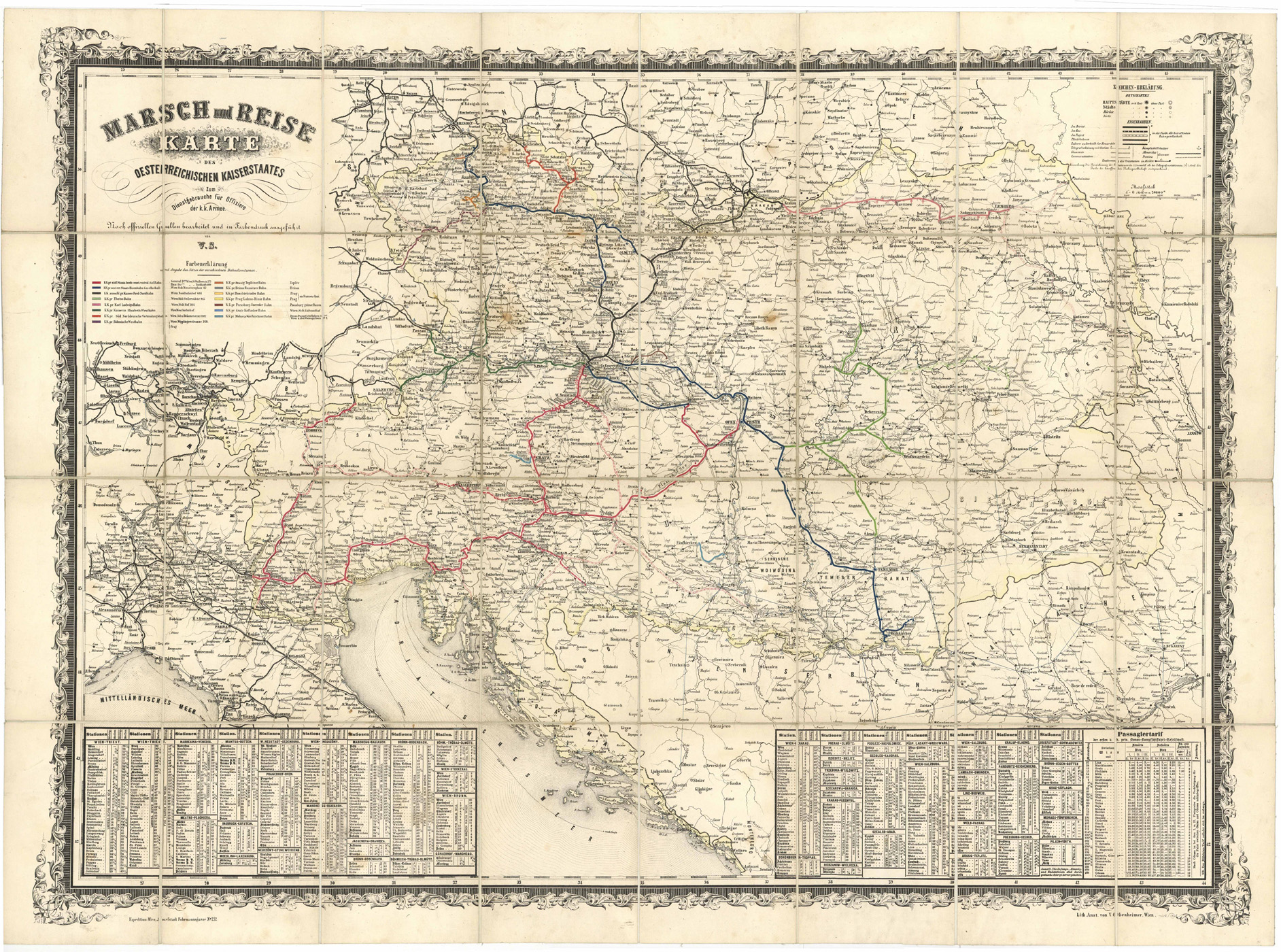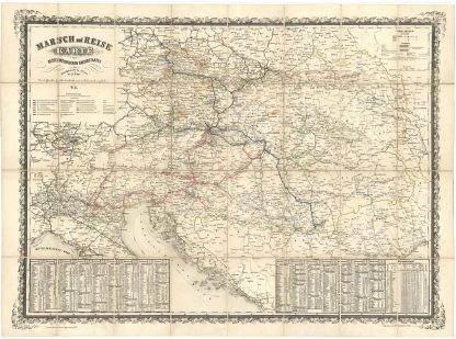 Zeigt den Österreichischn Kaiserstaat mit den Ländern Ungarn, Siebenbürgen, Galizien, Kroatien und Slavonien, Banat, Böhmen, Lombardei-Venedig, Dalmatien, Illyrien, Steiermark, Mähren, Schlesien, Tirol und Vorarlberg. – Oben links Titelkartusche; darunter Farberklärungen und Angaben der verschiedenen Bahndirektionen. – Unten rechts Auflistung der verschiedenen Bahnverbindungen und Passagiertarif für die Donau-Dampfschifffahrt. – Faltkarte auf Leinen in 32 Segmenten. – Im oberen Bereich leichte Braunstellen. – Selten!