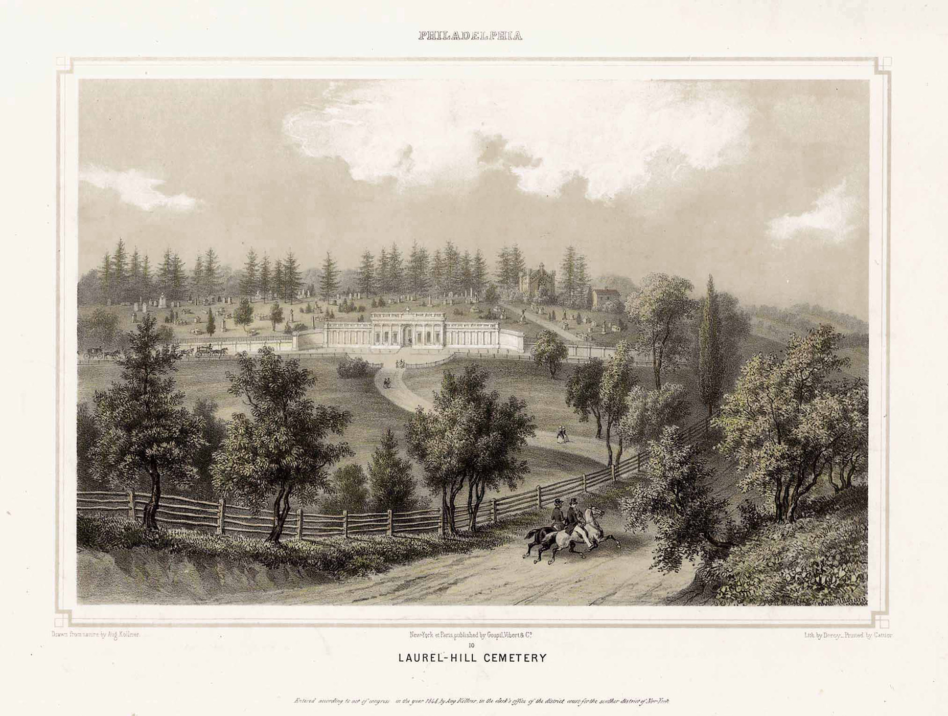 Laurel-Hill Friedhof (‘Laurel-Hill Cemetery. – Philadelphia – Drawn from the nature by Aug. Köllner. – Lith. by Deroy_Printed by Cattier. – Entered according to act of congress in the year 1848, by Aug. Köllner, in the clerk’s office of the district court for the souther destrict of New York. – New York et Paris, published by Goupil, Vibert & Co.’), getönte Lithographie v. Isidore-Laurent Deroy, gedruckt bei Cattier n. Augustus Kollner aus Views of American Cities b. Goupil, Vibert & Co. in New York & Paris, dat. 1848, 20,8 x 30,2 cm