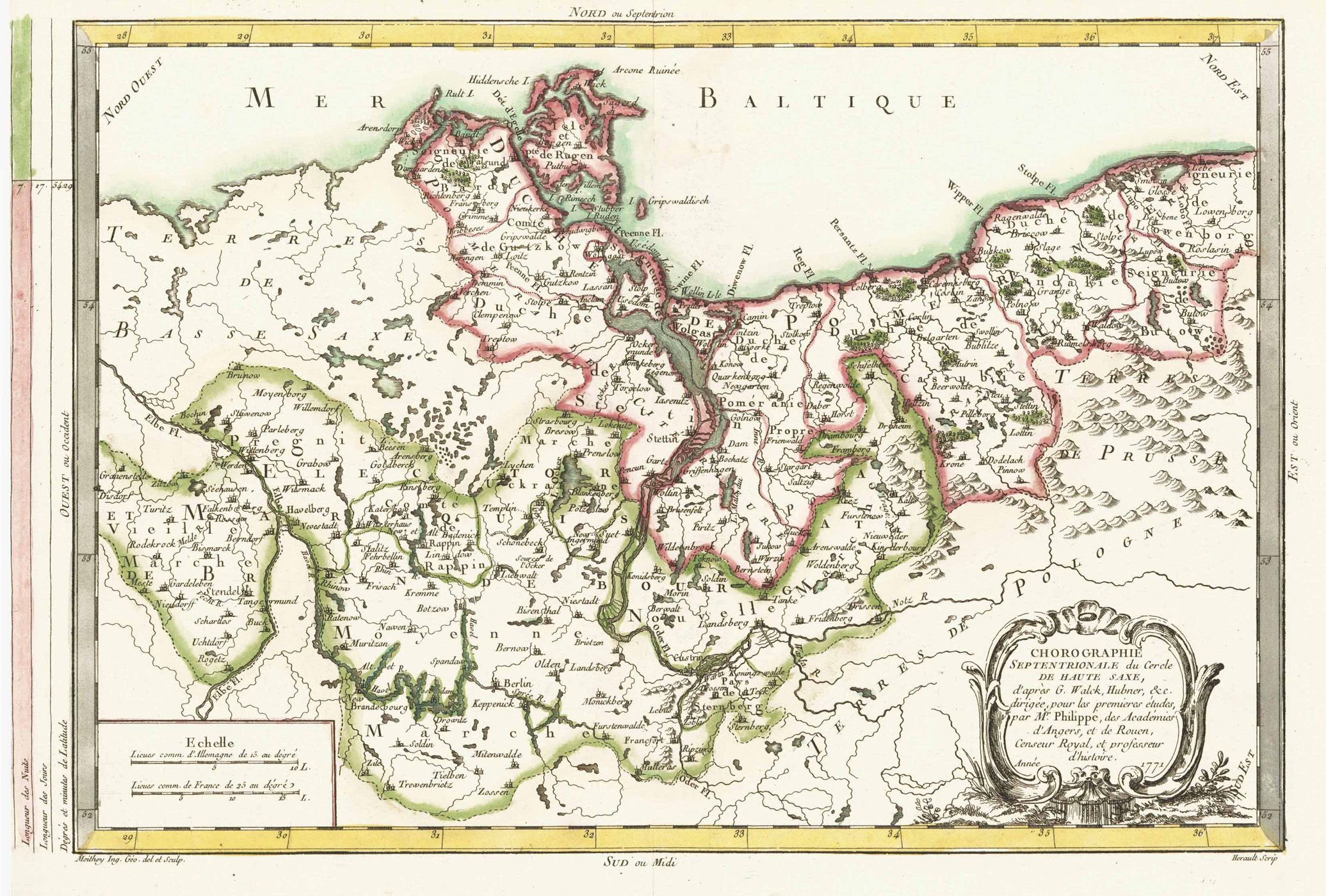 Tooley’s Dic. of Mapm. Rev. Ed. E – J, S. 313 (Hérault, -. French script engraver. Worked for Maurille Antoine Moithey, 1773; for Etienne André Philippe De Prétot, 1787; …); Tooley’s Dic. of Mapm., S. 443 (Maurille Antoine Moithey, 1732-1810. Rue de la Harpe vis à vis la Sorbonne. Ingénieur Géogr. du Roi 1780, … Collaborated with Crépy 1769-1777 and with Philippe de Pretot 1787. …) u. S. 503 (Etienne André Philippe De Pretot, 1708-1787. Royal Censor, Prof. Hist. Roy. Acad. Sciences, Paris. … Atlas Univ. 1787, …). – Zeigt Vor- u. Hinterpommern mit Brandenburg. – Unten rechts Titelkartusche; unten links Maßstab.