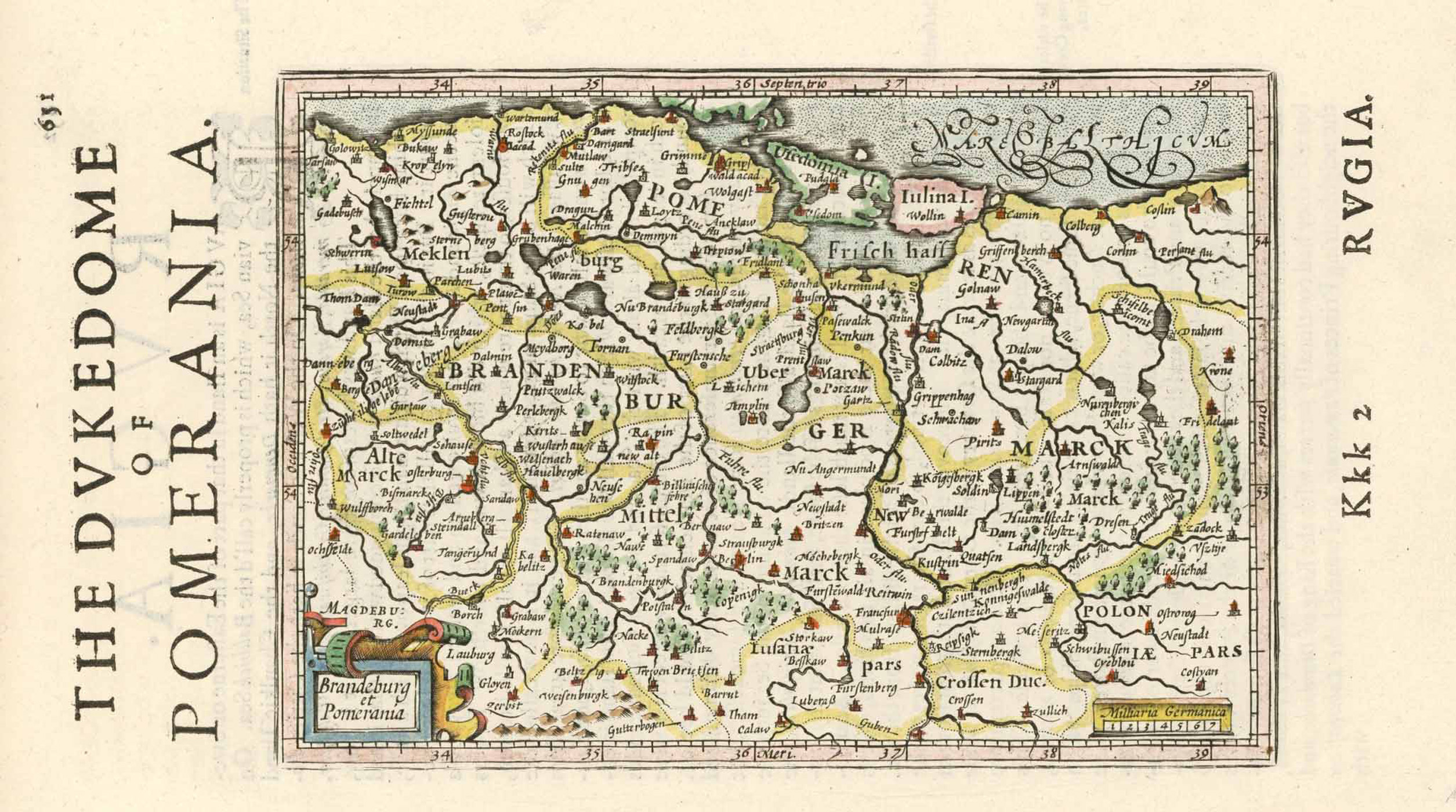 van der Krogt, Koeman’s Atlantes Neerlandici, Vol. III A, page 504. – Michael Sparke, Buchhändler in London von 1616 bis 1653, verlegte eine englische Ausgabe des Mercator Atlases. – Der Text wurde von Wye Saltonwall übersetzt. – Zeigt Brandenburg und Pommern. – Unten links Rollwerkskartusche.