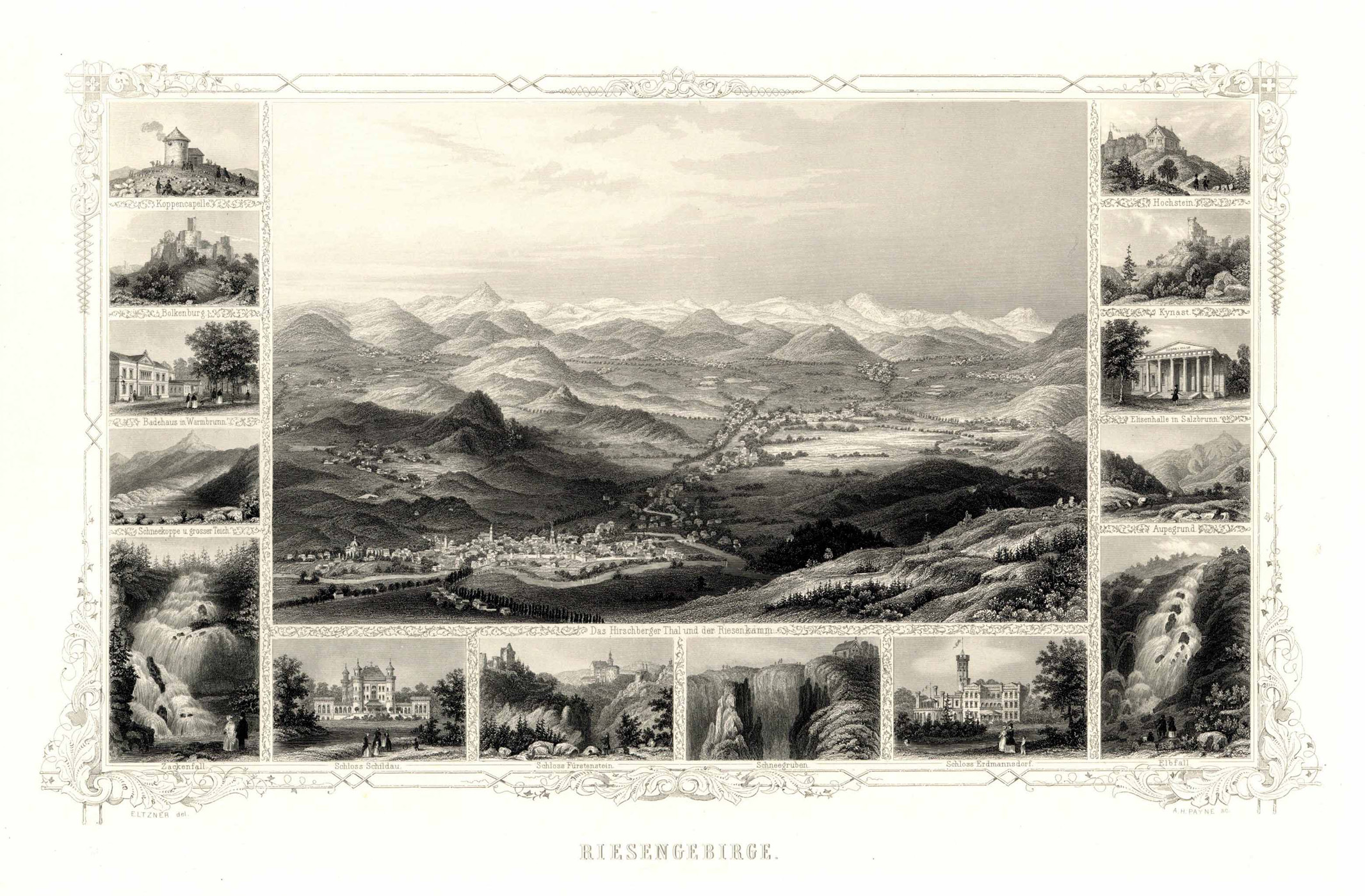 Souvenirblatt mit 15 Ansichten. – Mittig das Hirschberger Tal und der Riesenkamm umgeben vom Hochstein, Kynast, Elisenhalle in Salzbrunn, Aupegrund, Elbfall, Schloß Erdmannsdorf, Schneegruben, Schloß Fürstenstein, Schloß Schildau, Zackenfall, Schneekoppe u. grosser Teich, Badehaus in Warmbrunn, Bolkenburg und Koppenkapelle.