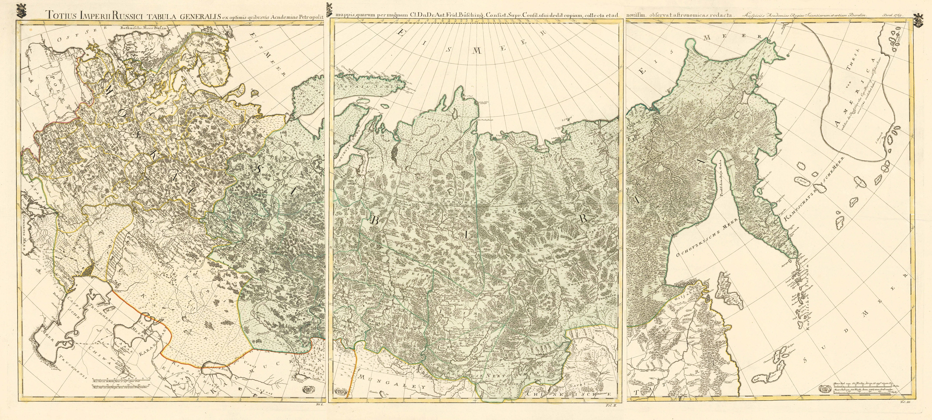 Abhandlung der Preussischen Akademie der Wissenschaften, Jahrgang 1933, S. 51f; Tooley’s Dic. of Mapm. Rev. Ed. A – D, S. 215 (A.F. Büsching 1724-1793 war lutheranischer Theologe, Geograph, und Professor der Philosophie in Göttingen). – Imposante Karte des gesamten Russischen Reiches in seiner Ausdehnung von der Ostsee bis Kamtschatka und Alaska und zum Altaigebirge. – Im europäischen Teil sind die Poststraßen und Gouvernementsgrenzen eingetragen. – Das Gewässernetz ist auch im asiatischen Teil aufgrund der Ergebnisse der großen Sibirien-Expeditionen bereits sorgfältig wiedergegeben. Kamtschatka und die Kurilen sind annähernd korrekt gezeichnet, während das angrenzende Alaska aufgrund von Berings Entdeckungen von 1741 erst ganz vage als “Theil von America welchen die Russischen See Cap. Bering und Tschirikow anno 1741 entdecket haben” angedeutet ist. – Am 20. August 1768 regte A.A. Rhode an, eine bei der Kaiserlichen Akademie der Wissenschaften in Petersburg erschienener Atlas (“Russischer Atlas, welcher in einer General-Charte und 19 Spezial-Charten das gesamte Russische Reich und dessen angraenzende Länder nach den Regeln der Erdbeschreibung und den neuesten Observationen vorstellig macht”) einer größeren Generalkarte von Russland dem Publikum leichter zugänglich zu machen. – Eine in dessen Format das ganze russische Reich behandelte Karte lag noch nicht vor. – Rhode bat 1768 den Oberkonsistorialrat Büsching, der besonders gutes Kartenmaterial hatte, bei seiner geplanten Karte damit auszuhelfen. – Büsching war bei Zubilligung von sechs Exemplaren der Neuveröffentlichung sowie je eines Exemplars von fast allen übrigen im Verlage der Akademie erschienenen Kartenwerke dazu bereit. – Im November 1768 stellte Büsching nicht nur eine Menge guter Karten und Zeichnungen von Russland zu, sondern gab A.A. Rhode auch die Anweisung, wo er die letzten Jahren gewonnenen Bestimmungen der Längen und Breiten finden könnte. Etwa Mai 1769 war Rhode mit der Zeichnung der 3 Sektionen fertig. – Ende des Jahres scheint der in Berlin, wahrscheinlich bei Schleuen gefertige Kupferstich fertig gewesen zu sein. – Die Karte stellt das gesamte europäische und asiatische Russland dar. – Büsching war zwar von der Zeichnung Rhodes enttäuscht, scheint sich aber damit abgefunden zu haben, da er von ihr sagte: “sie war so gut, als sie damals geliefert werden konnte”. – Auch das sie selbst nach Russland häufig verlangt wurde, hob er rühmend hervor. – Jede der drei breitrandigen Karten am Rand mit dem vorgeschriebenen Steuerstempel der Berliner Akademie versehen. – Die Karte mit Titelkopfleiste. – Unten links und rechts jeweils Maßstäbe. – Die Karten noch nicht zusammengesetzt. – Sehr seltener Einblattdruck. – In mint condition!