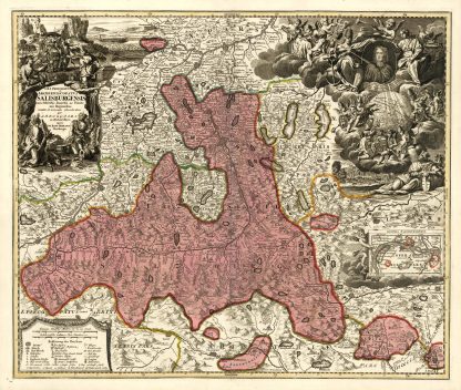 Schaup, Salzburg auf alten Landkarten 3.1. – Zeigt das Bistum Salzburg. – Oben links Titelkartusche mit dem Allianzwappen Salzburg-Harrach. – Ein an das Wappen gelehnter Putto zeigt auf ein beladenes Salzschiff. – Rechts oben großer “Barockhimmel” mit dem Porträt von Erzbischof Franz Anton Fürst Harrach (1709-1727). Darunter Weltkugel mit dem Titel “Hierarchia Salisburgensis”. – Unten in der Kartusche Ansicht von Maria Plein. Daneben lagert Juvavia mit dreitürmiger Mauerkrone und dem Kreuz des Ruperti-Ritterordens, gestützt auf einen Salzbottich. – Am rechten Rand Insetkarte mit den Exklaven in Niederösterreich. – Links unten Kartusche mit Maßstab und Erklärungen. – Tadelloses altkoloriertes Exemplar in einem ausgezeichneten Druck und frühem Zustand!