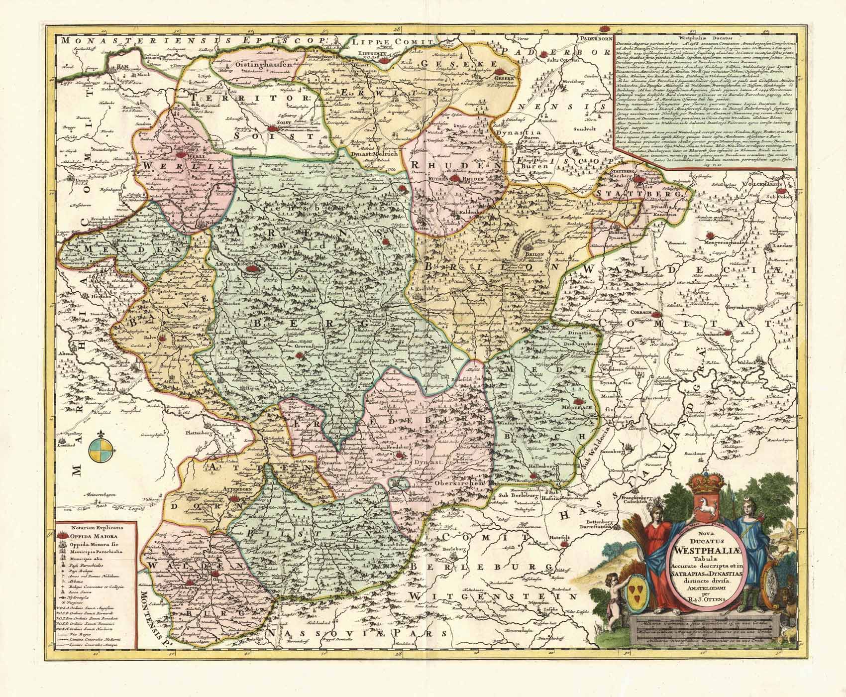 Tooley’s Dic. of Mapm. Rev. Ed. K – P, S. 362. – Zeigt das Gebiet zwischen Lippstadt, Olpe, Waldeck und Iserlohn. – Unten rechts Titelkartusche mit Allegorien, Wappen und Maßstab. – Oben rechts Legende mit kurzem Geschichtsabriß. – Unten links Erklärungen. – Die Karte mit Eintragungen von Poststraßen und Klöstern (Augustiner, Dominikaner, Zisterzienser, Prämonstratenser und Benediktiner). – Seltene Ordensprovinzkarte. – Die Karte mit außergewöhnlich schönem Altkolorit und perfektem Zustand!