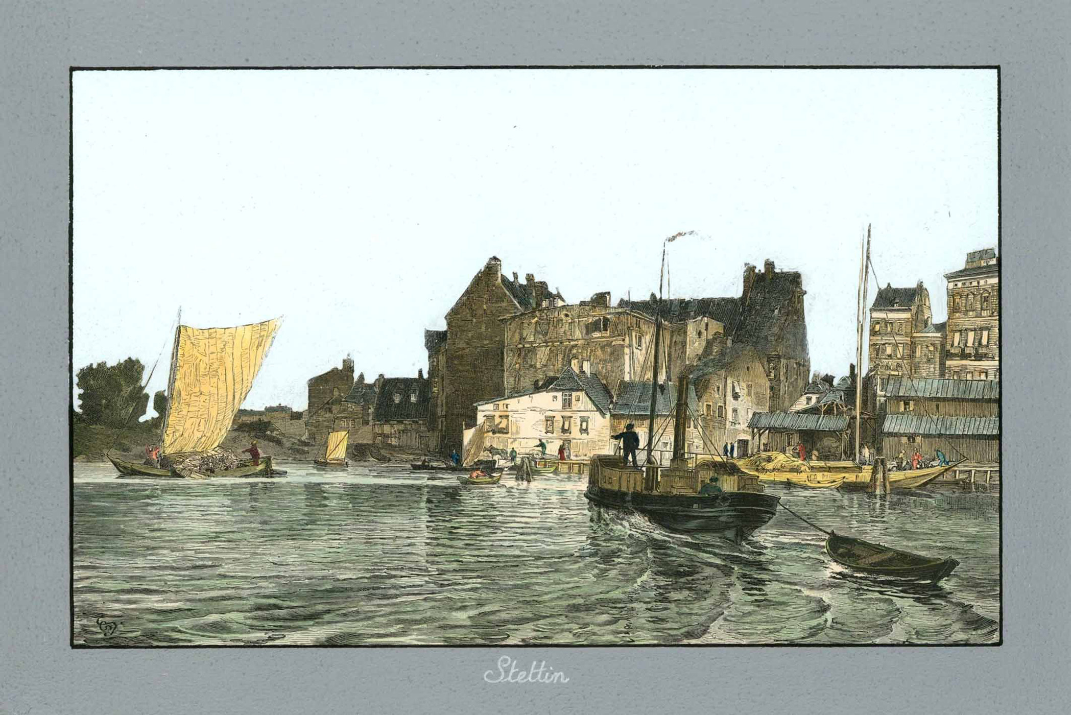 Hafen (‘Stettin’), gouachierter Holzstich mit grau getuschtem Rand n. Hubert Clerget, 1885, 15,5 x 23,5 cm