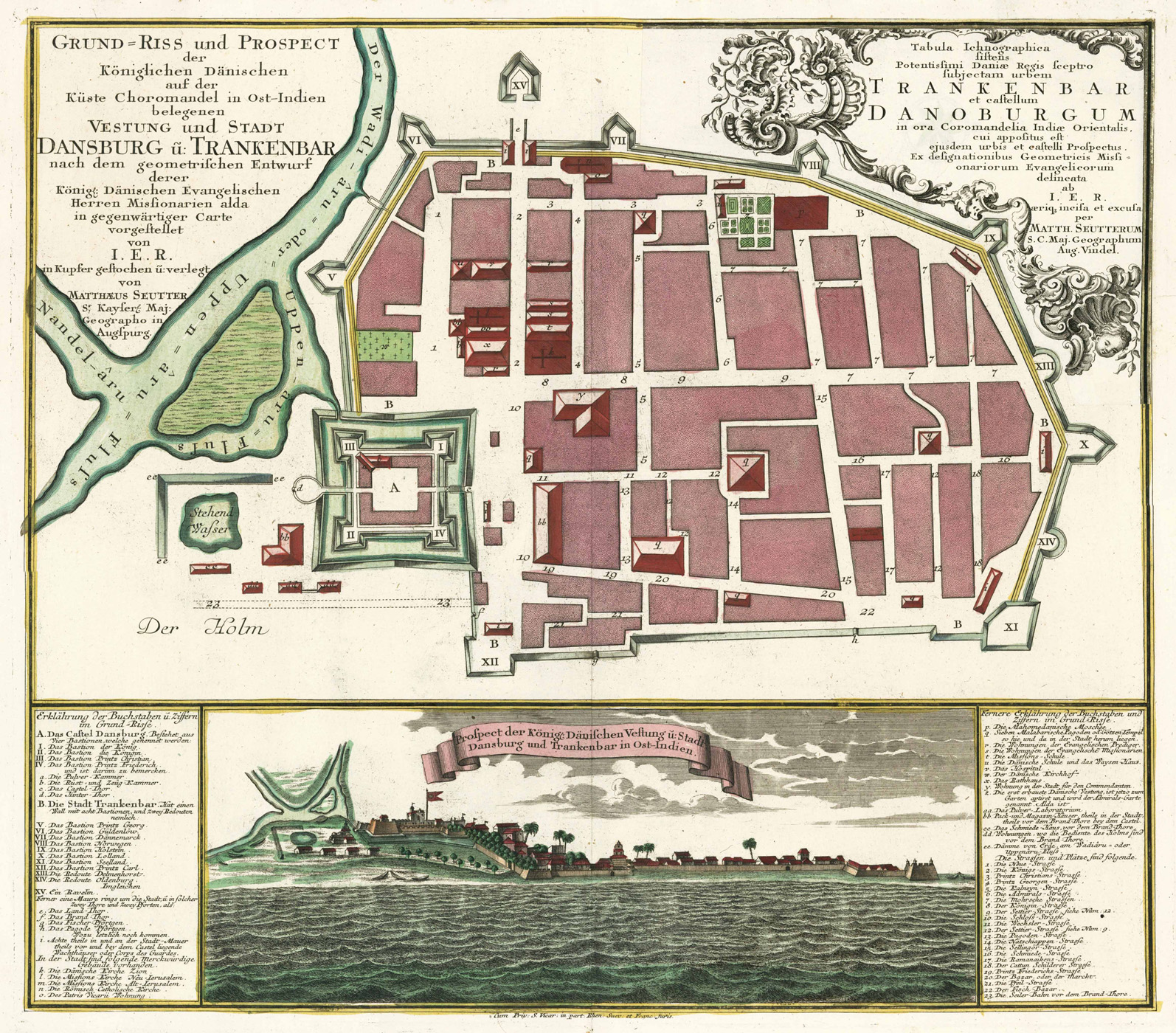 Sandler, Johann Baptista Homann, Die Homännischen Erben, Matthäus Seutter und Ihre Landkarten, S. 11, Nr. 287. – Zeigt einen großformatigen Stadtplan; darunter Gesamtansicht von Trankebar mit Fort Dansborg. – Links und rechts Erklärungen. – Oben links und rechts neben dem Stadtplan zwei Titelkartuschen in deutscher und lateinischer Sprache (separat gedruckter Titel). – Perfekter breitrandiger Zustand!