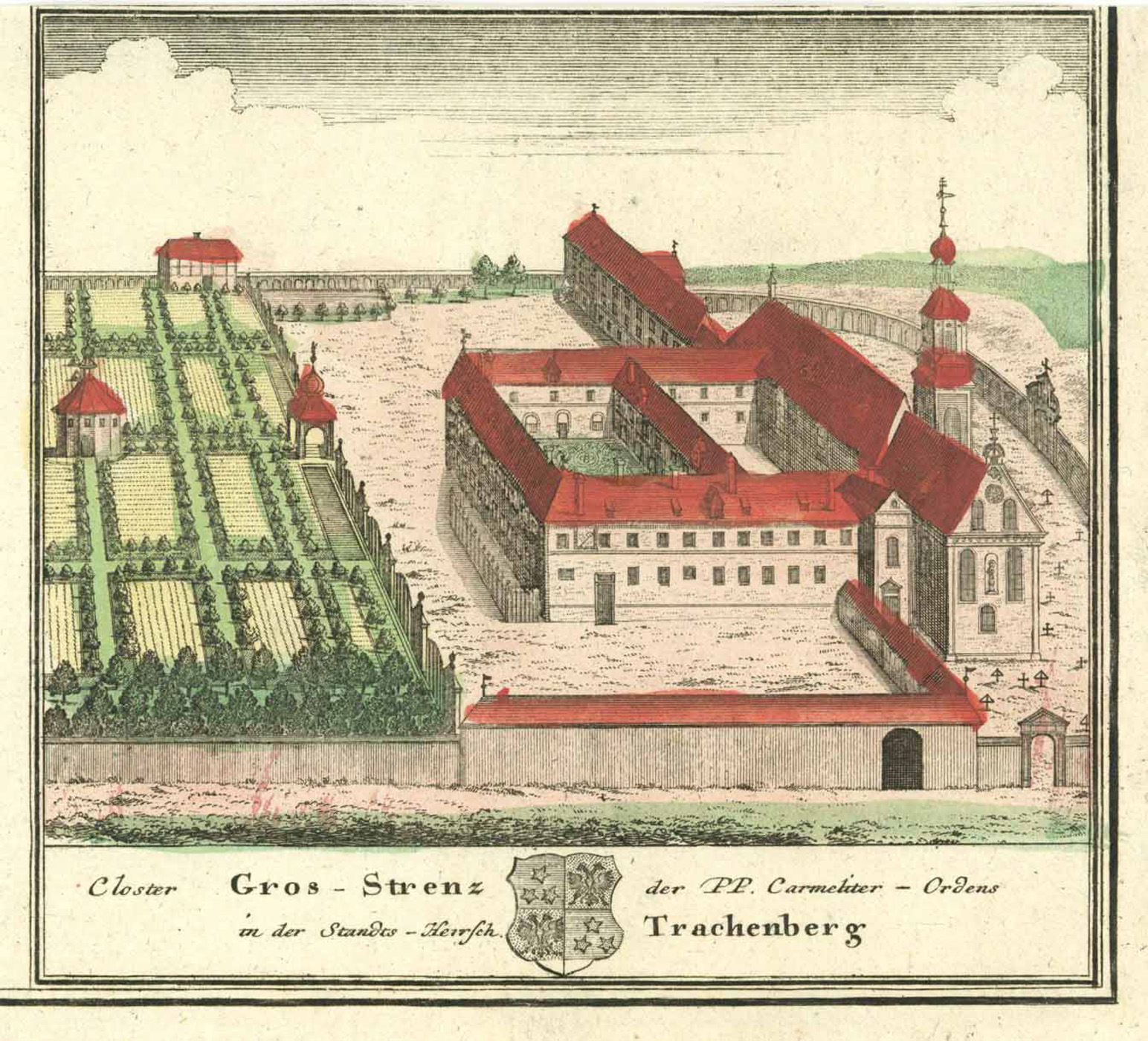 Gesamtansicht des Karmeliterkloster mit den Gartenanlagen (‘Closter Gros-Strenz der PP. Carmelter-Ordens in der Standts-Herrsch. Trachenberg’), altkolorierter Kupferstich v. Friedrich Bernhard Werner aus Scenographia Urbium Silesiae b. Homann Erben in Nürnberg, 1737-1752, 15 x 16 cm