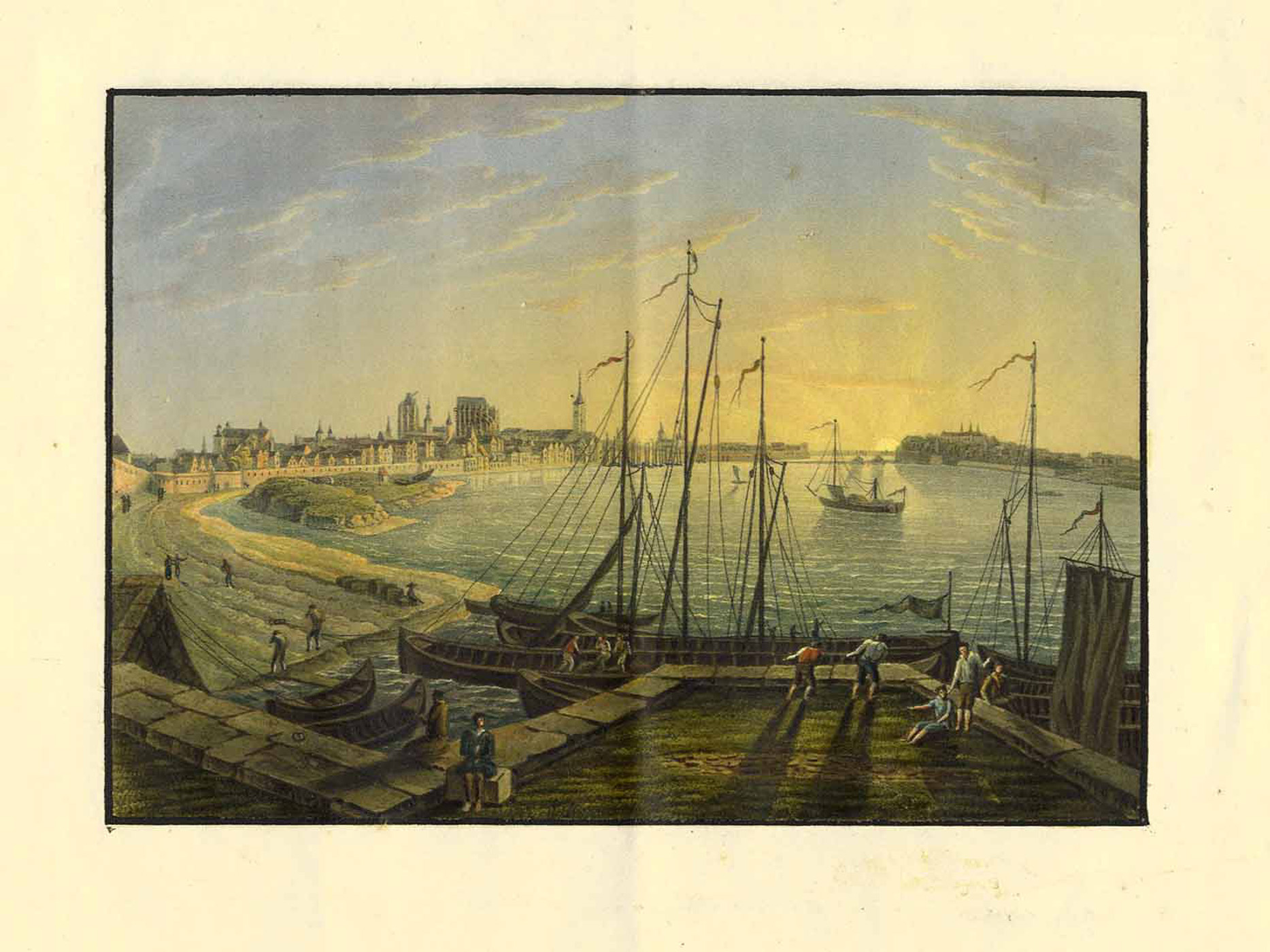 Gesamtansicht von Süden; im Vordergrund Schiffe und Hafenanlage, anonyme altgouachierte Umrissradierung auf dat. Whatman Bütten, dat. 1825, 11 x 15,5 cm